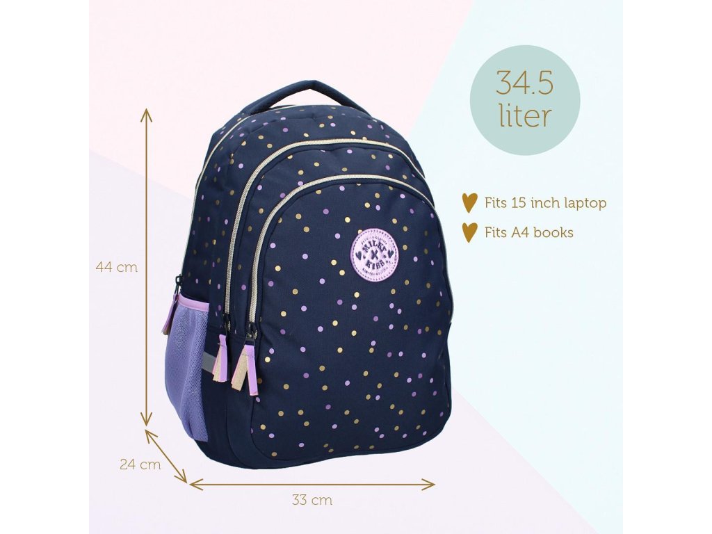 Rozměry: 44 x 33 x 24 cm. Materiál: polyester. Kapacita: 34,5 l. Hmotnost: 590 gr. Dvoukomorový, jedna hlavní a jedna přední kapsa, postranní perforované na nápoj. Kvalitní provedení, polstrované popruhy a záda, reflexní prvky. Barva: tm. modrá. Výrobce: Vadobag. Vadobag Europe B.V.Technopol 335026 SB Tilburg, Holandia salessupport@vadobag.nl