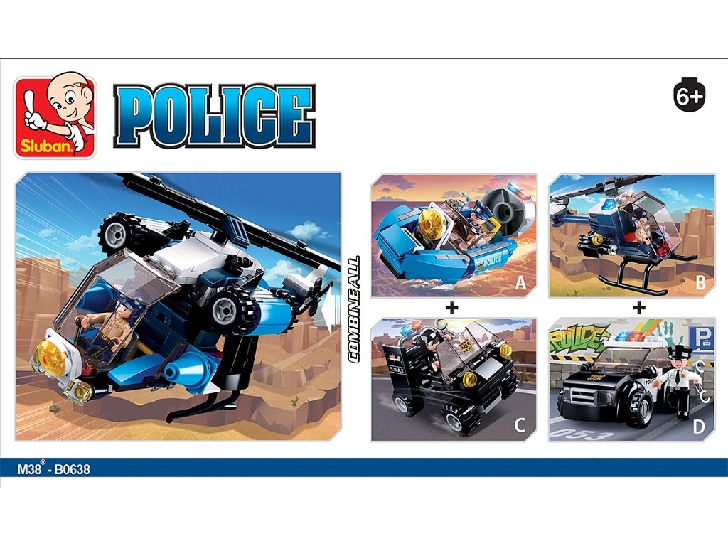 Ministavebnice policejní techniky ze série Policie 4into1, jejíž kompletací vznikne možnost sestavit velký ucelený model helikoptéry. Inovativní stavebnice Sluban je možno kombinovat s podobnými stavebnicemi mnoha dalších významných výrobců. Jsou vyráběny z kvalitního, nezávadného a odolného ABS plastu. Každá stavebnice je opatřena návodem k sestavení a balena v pestře potištěné papírové krabičce. Hlavní vlastnosti:88 dílků, 1 figurkastřední obtížnostkompletací série lze sestavit velký modelinovativní figurky s otáčivými i výkyvnými částmi tělkompatibilní se stavebnicemi dalších výrobcůDoplňkové parametry