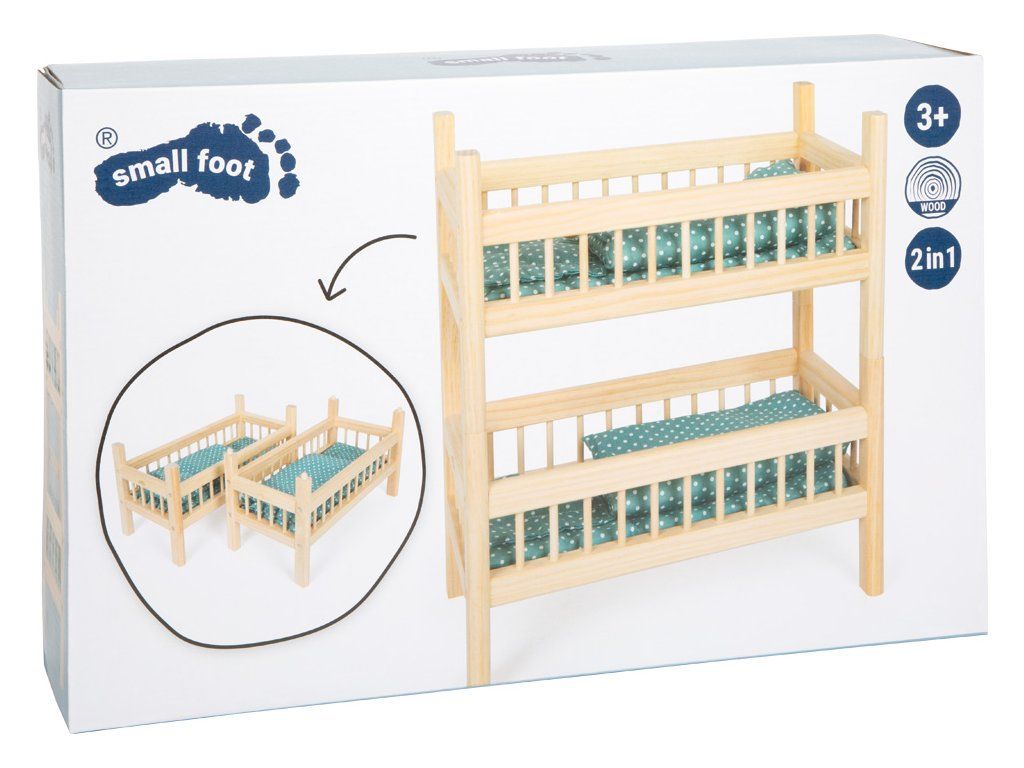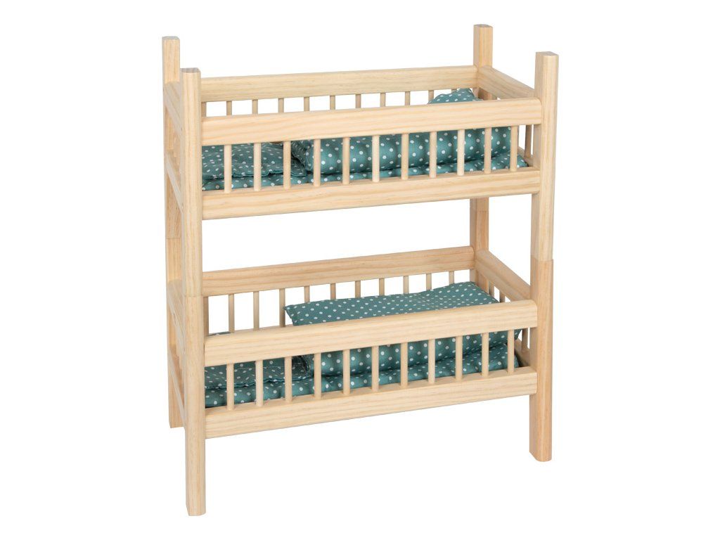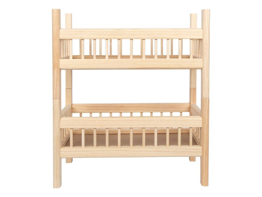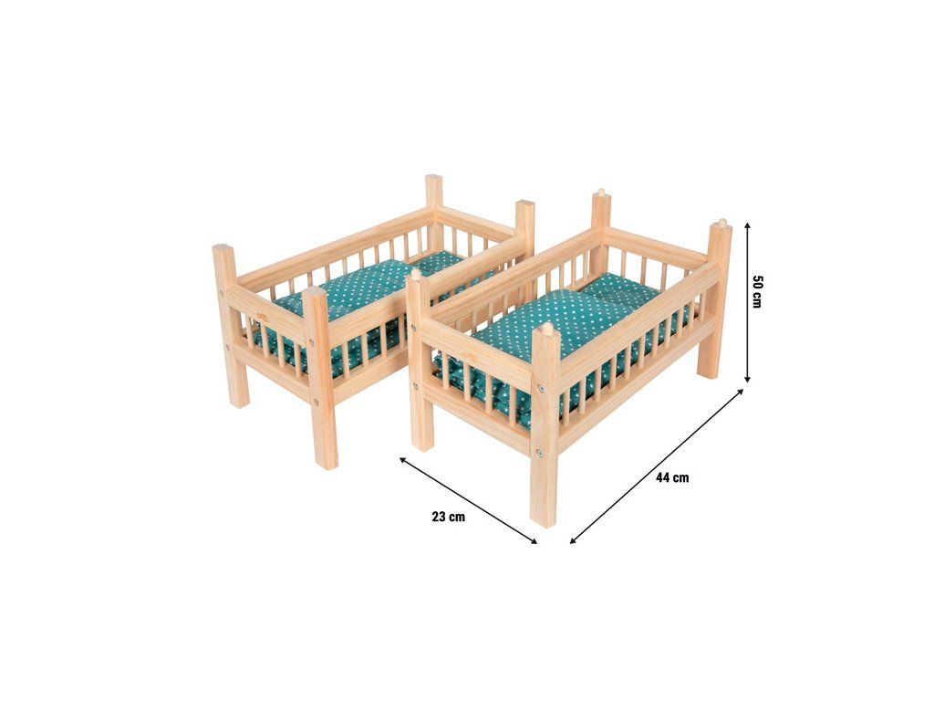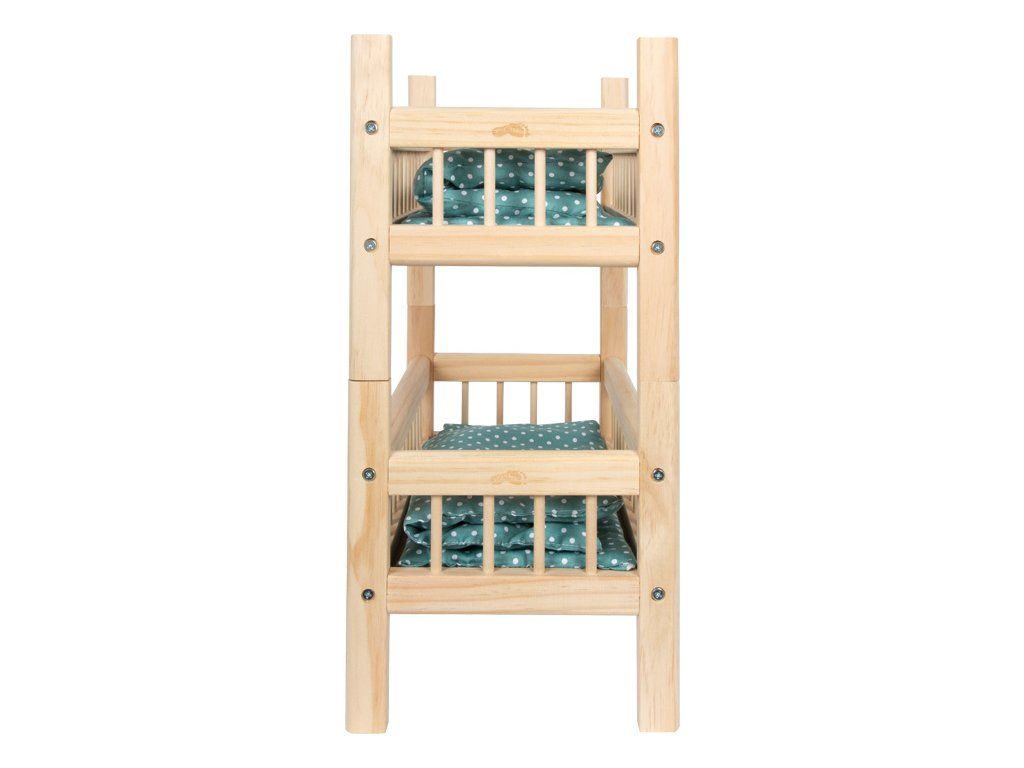 Čas na spaní pro panenky a plyšové kamarády!Tato patrová postel pro panenky z odolného přírodního dřeva nabízí dvojnásobný prostor pro spánek. Lze ji použít jako patrovou postel, nebo ji snadno rozdělit na dvě samostatná lůžka. Díky zaobleným hranám, kvalitnímu zpracování a velikosti vhodné pro panenky a plyšové hračky do 39 cm je ideální volbou pro malé rodiče. Součástí je i pohodlné ložní prádlo – velké deky, polštáře a prostěradla, které zajistí panenkám útulné místo pro odpočinek. Tato variabilní postýlka se snadno přizpůsobí každé hře. Jako patrová postel přináší zábavu na dvou úrovních, jako dvě samostatné postele umožňuje hru s více panenkami najednou. Přirozený vzhled a jednoduchý design z ní dělají stylový a nadčasový doplněk do dětského pokoje. Hraní na uspávání a péči o panenky podporuje rozvoj empatie, sociálních dovedností i porozumění každodenním situacím, děti tak přirozeně napodobují svět dospělých. Hlavní vlastnosti: postel pro panenky 2 v 1 lze používat jako dvě samostatné postele nebo složit jako patrovou postel vyrobena z pevného přírodního dřeva zaoblené hrany pro bezpečné používání dětmi včetně ložního prádla - 2 extra velké přikrývky, 2 polštáře a 2 prostěradla vhodná pro panenky a plyšové hračky do velikosti 39 cm podporuje sociální a kreativní hraní rolí ideální doplněk k nábytku pro panenkyDoplňkové parametry