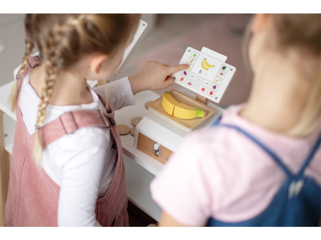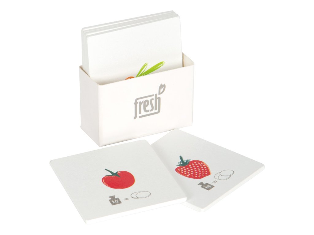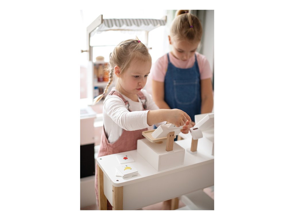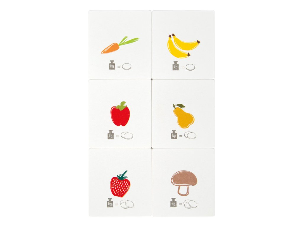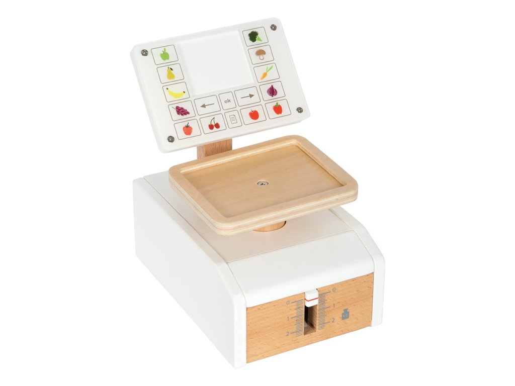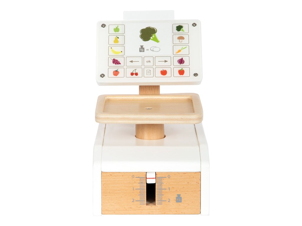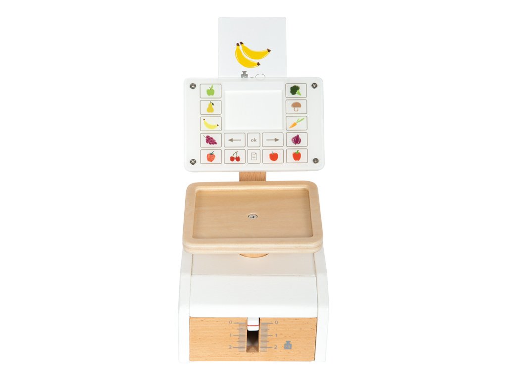 Važte ovoce a zeleninu jako v supermarketu. Tato dřevěná váha s velkou vážící plochou je tím pravým doplňkem pro vážení hracích potravin v obchodě, nebo v dětské kuchyňce. Integrovaný pružinový mechanismus zajišťuje obzvláště realistickou herní zábavu, protože pohyblivý ukazatel hmotnosti a vážicí miska se pohybují nahoru a dolů, když je něco položeno na váhu. Velký displej je vyroben z vysoce kvalitního akrylátového skla, který je potištěný ovládacími prvky a obrázky ovoce a zeleniny. Šest produktových karet potištěných na obou stranách s obrázky ovoce a zeleniny lze vložit shora do střední oblasti „displeje“. Tato váha z produktové řady „fresh“ je nutností v každém dobře zásobeném obchodě. Snadná ovladatelnost a jednoduchý mechanismus vážení umožňují dětem intuitivně porozumět procesu měření váhy. Aby děti pochopily různé ceny, jsou na kartách s jídlem obrázky mincí - čím více mincí je, tím dražší je vážené kilo ovoce nebo zeleniny. Vysoce kvalitní zpracování dřeva a akrylového skla dělá z váhy opravdový poutač v dětském pokoji, který slibuje dlouhotrvající zábavu. Manipulace s váhou trénuje také jemnou motoriku a koordinaci ruky a oka. Hlavní vlastnosti: váha s extra velkou vážicí miskou6 produktových karet potištěných na obou stranáchfunkční mechanismus, pohyblivý ukazatel hmotnostirozvíjí základní matematické a konceptuální dovednosti, jako je počítání a porovnávání hmotnostiproduktová řada „fresh“Doplňkové parametry