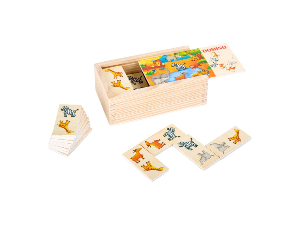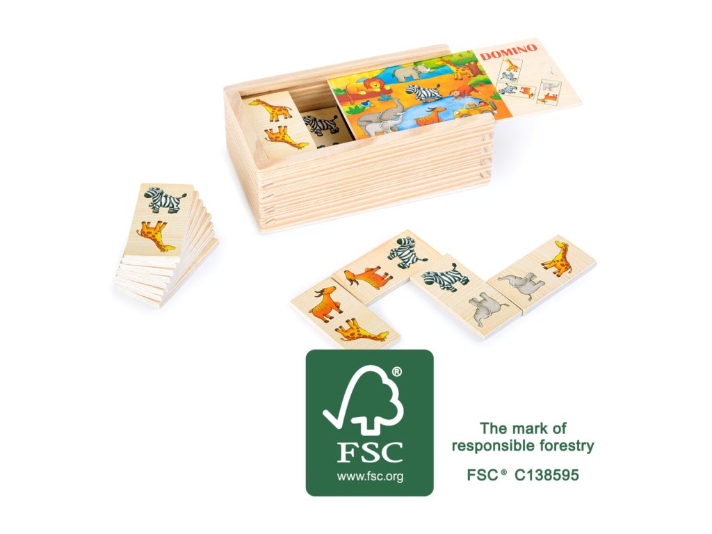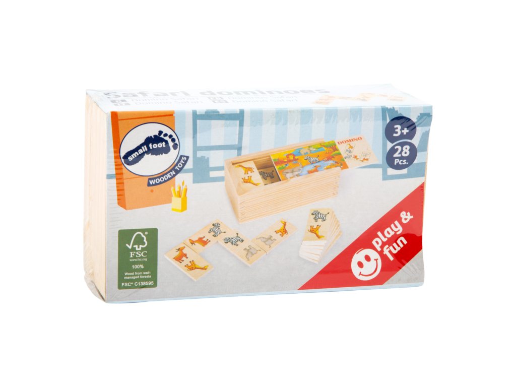 Nechť hra začne! Toto domino je vyrobeno ze 100% certifikovaného FSC® dřeva. Velké kostky se zvířaty safari. Dílky lze jednoduše uložit do dřevěného boxu. Hlavní vlastnosti: rozvíjí jemnou motoriku dětípodporuje logické myšlenívyrobeno ze 100% FSC dřeva Značka a certifikát FSC® (Forest Stewardship Council) zaručuje, že dřevo, ze kterého byl produkt vyroben, nebylo vytěženo nelegálně a pochází z lesů obhospodařovaných šetrným či přírodě blízkým způsobem, ve kterém jsou dodržovány přísné environmentální a sociální požadavky. Značka FSC® na výrobku znamená, že svým nákupem pomáháte chránit lesy a podporujete šetrné, odpovědné či přírodě blízké hospodaření, díky kterému jsou naše lesy stabilnější, zdravější, mají přirozenou druhovou skladbu a lépe odolávají negativním následkům klimatických změn.Doplňkové parametry