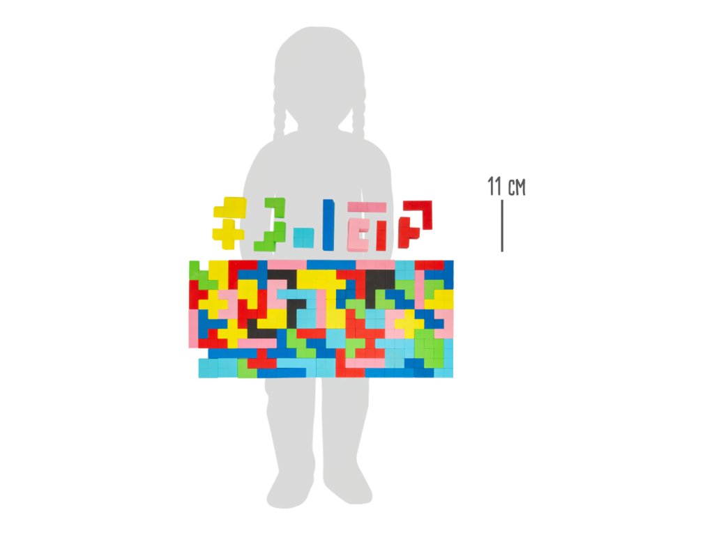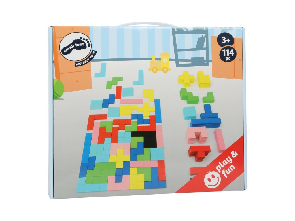 Tato 114 dílná dřevěná hra nabízí nekonečné možnosti hraní. Inspirováno světově známou klasickou počítačovou hrou, cílem je poskládat různé geometrické tvary. Z dílků skládačky lze vytvořit barevné a individuální mozaiky v nesčetných kombinacích. Tato hra podporuje motorické dovednosti a podporuje kreativitu a fantazii. Kromě toho také trénuje rozpoznávání barev a tvarů. Dílky jsou vyrobeny z odolné překližky a ošetřeny nezávadnými barvami. Dodáváno v kufříkové kartonové krabičce, s pomocí které mozaiku hravě uklidíte a snadno přenesete. Hlavní vlastnosti: 114 dílků celkem, 13 různých tvarů v 7 barváchpomáhá rozvíjet logiku, jemnou motoriku a představivostodolné dřevěné provedenípraktické baleníDoplňkové parametry