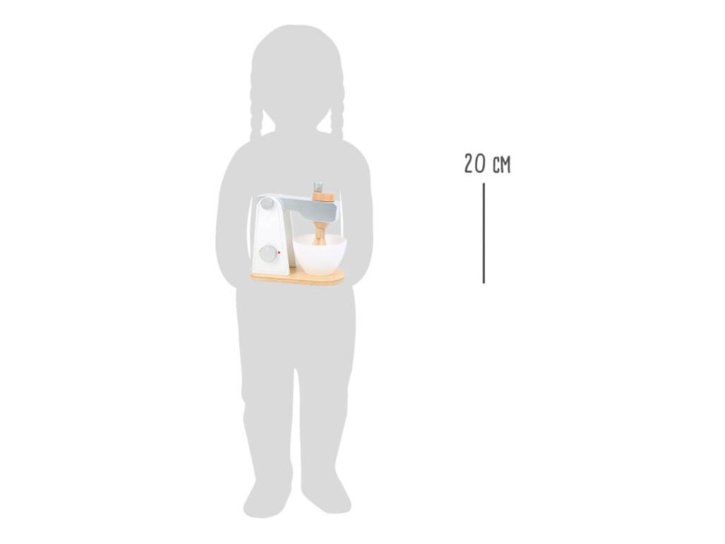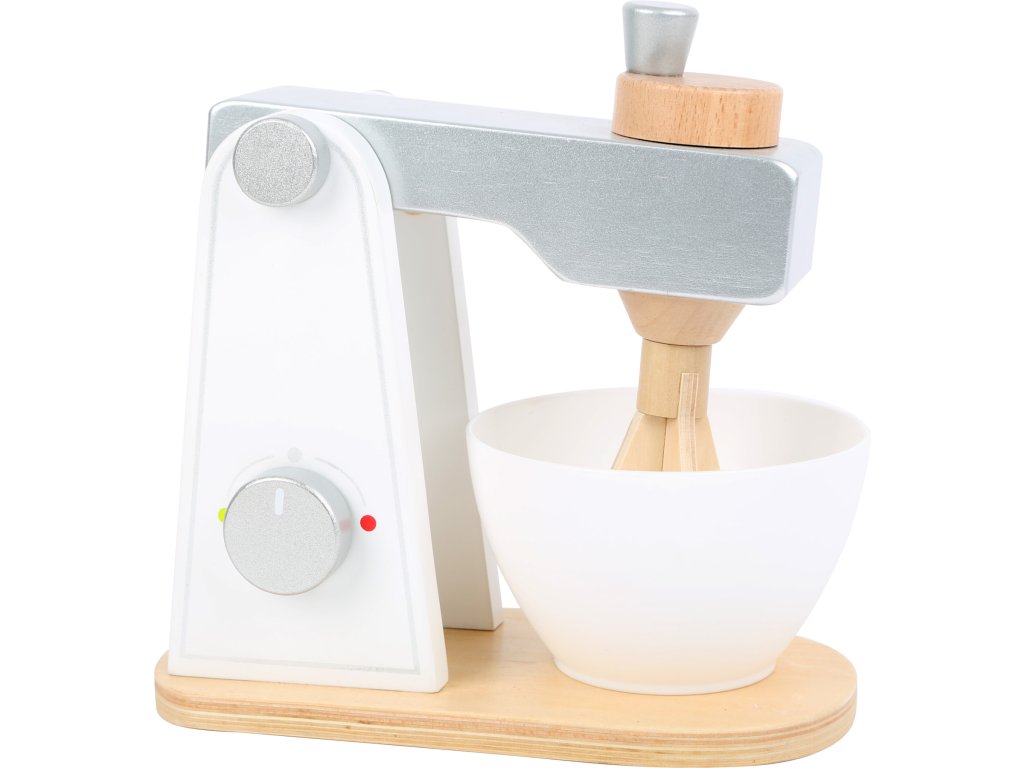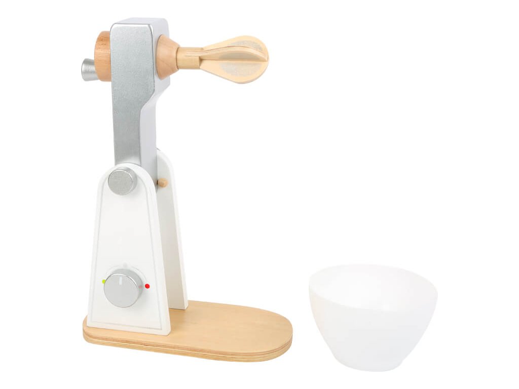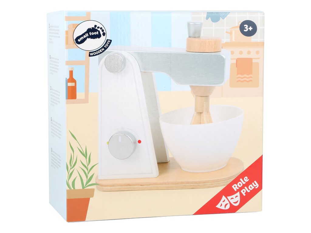 Tento stabilní dřevěný mixér míchá těsto pomocí otočných metliček a plastové mísy. Sklápěcí mixovací hlava, která se dá odklopit nahoru, umožňuje snadné vyjmutí mísy. Mixér má stabilní základnu díky podstavci. Hlavní vlastnosti: ideální doplněk dětských kuchyněkstabilní provedení pohyblivá hlava mixérurozvoj sociálních dovednostíDoplňkové parametry