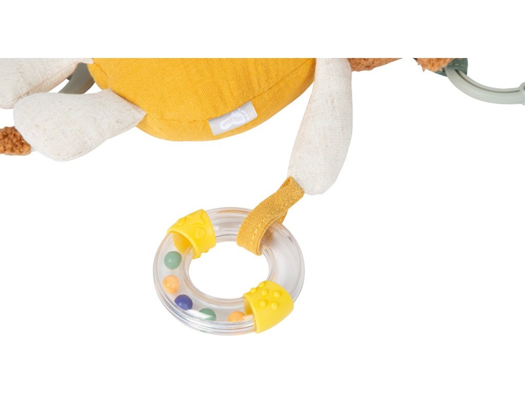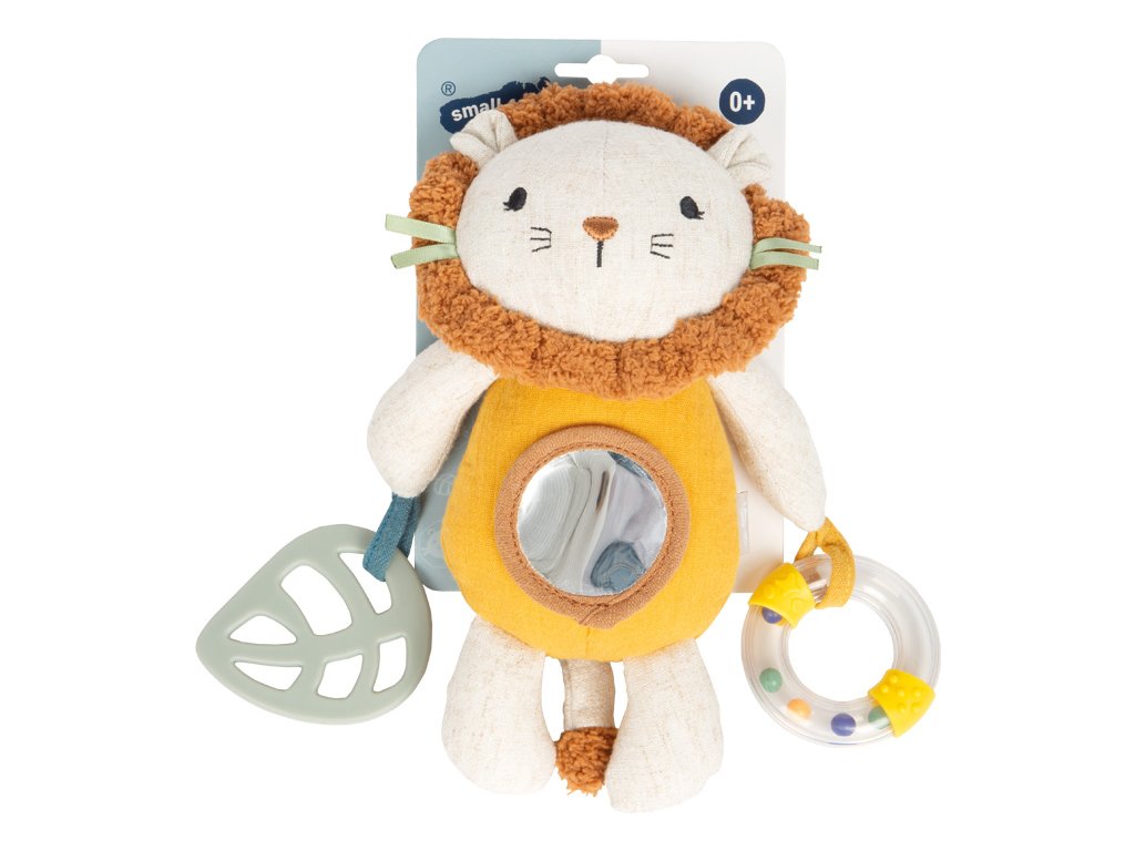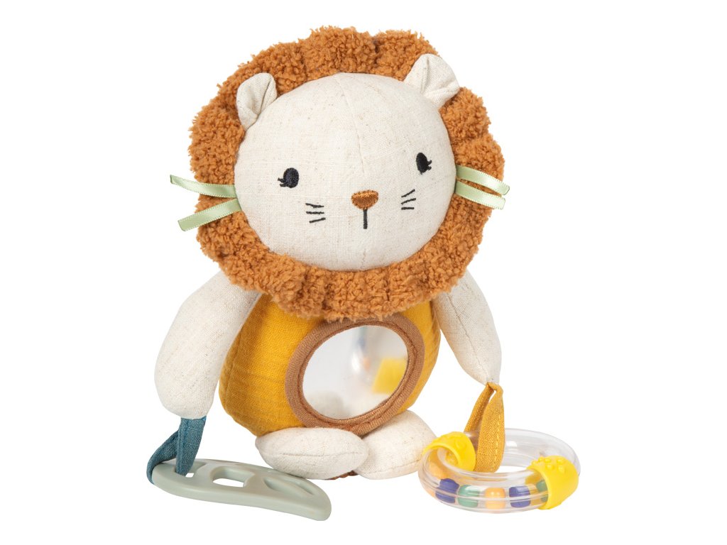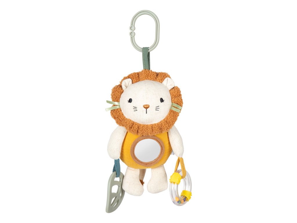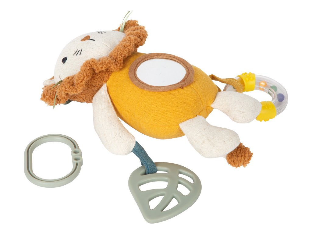Mačkat, uchopovat, objevovat!Plyšová závěsná hračka Lvíček je všestranným společníkem pro miminka a batolata. Díky kombinaci kousátka, chrastítka a různých textur látek nabízí bohaté smyslové podněty a podporuje hravý rozvoj dítěte. Praktické závěsné poutko umožňuje snadné připevnění ke kočárku, autosedačce nebo na hrací hrazdičku. Měkká mušelínová látka, roztomilý lví obličej a příjemně mazlivý povrch dělají z této hračky oblíbeného společníka pro každý den.Tato multifunkční závěsná hračka v sobě spojuje senzorickou hračku, pomůcku při prořezávání zoubků i mazlivého kamaráda v jednom láskyplně navrženém produktu. Plyšový lvíček je vyroben z hebkého mušelínu, jehož jemně strukturovaný povrch stimuluje hmat a je příjemný i pro ty nejmenší děti. Různorodé materiály a integrované chrastítko vybízejí k dotýkání, poslouchání a objevování, zatímco kousátko poskytuje úlevu při prořezávání zoubků. Hlavní vlastnosti: multifunkční látková hračka pro miminka s motivem lvaintegrované chrastítko a kousátko pro senzorickou stimulaciideální velikost pro malé dětské ručičkyrozvíjí jemnou motorikupřipevnitelné ke kočárku, postýlce či autosedačcevyrobeno z měkké mušelínové tkaniny s texturovaným povrchempodporuje uchopení, dotýkání a první smyslové zážitkyperfektní hračka na cesty i domavhodné od narozeníDoplňkové parametry
