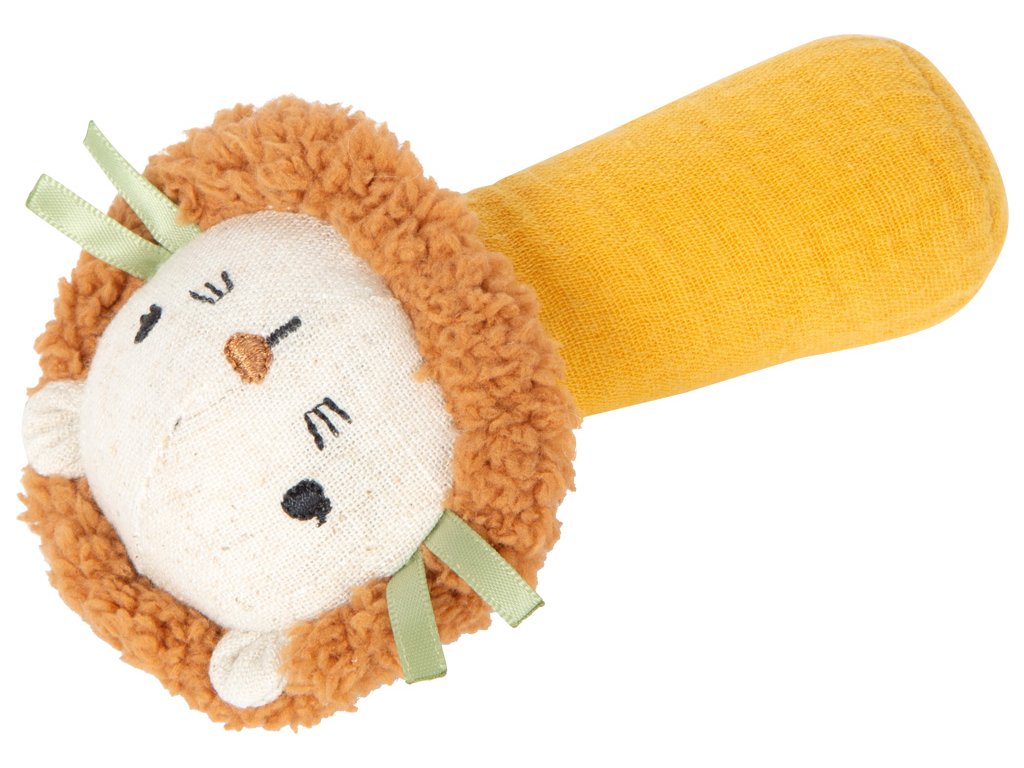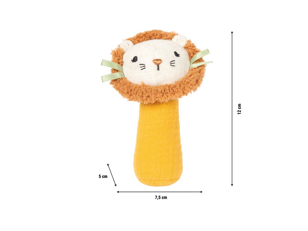 Chyť, poslouchej, objevuj!Toto kompaktní chrastítko přináší radost dětem už od prvních měsíců života. Měkká tkanina, přátelský lví obličej a jemné chrastivé zvuky vybízejí k hravému objevování. Praktický tvar je přizpůsoben malým dětským ručičkám a podporuje cílené uchopování i držení. Integrované chrastítko stimuluje sluchové vnímání, zatímco měkký materiál zajišťuje příjemný a bezpečný herní zážitek, a to i při ještě nekoordinovaných pohybech.Ať už jako první chrastítko nebo senzorická hračka k uchopení, toto měkké mini chrastítko spojuje funkčnost, hravý design a provedení vhodné pro děti. Veselý lví obličej upoutá pozornost miminka a chrastítko se rychle stane oblíbeným každodenním společníkem doma, na cestách i v kočárku. Hlavní vlastnosti: měkké mini látkové chrastítko s veselým designem lvaideální velikost pro malé dětské ručičkyintegrované chrastítko pro podporu sluchuvyrobeno z měkké mušelínové tkaniny s texturovaným povrchempodporuje uchopení, dotýkání a první smyslové zážitkyuklidňuje a poskytuje blízkost – ideální jako pomůcka pro spanívhodné od narozeníDoplňkové parametry