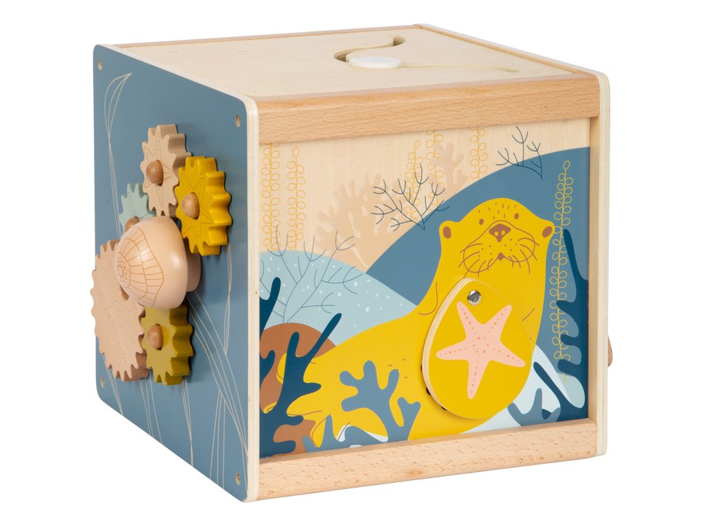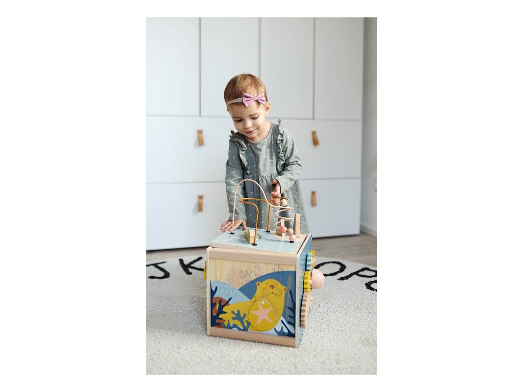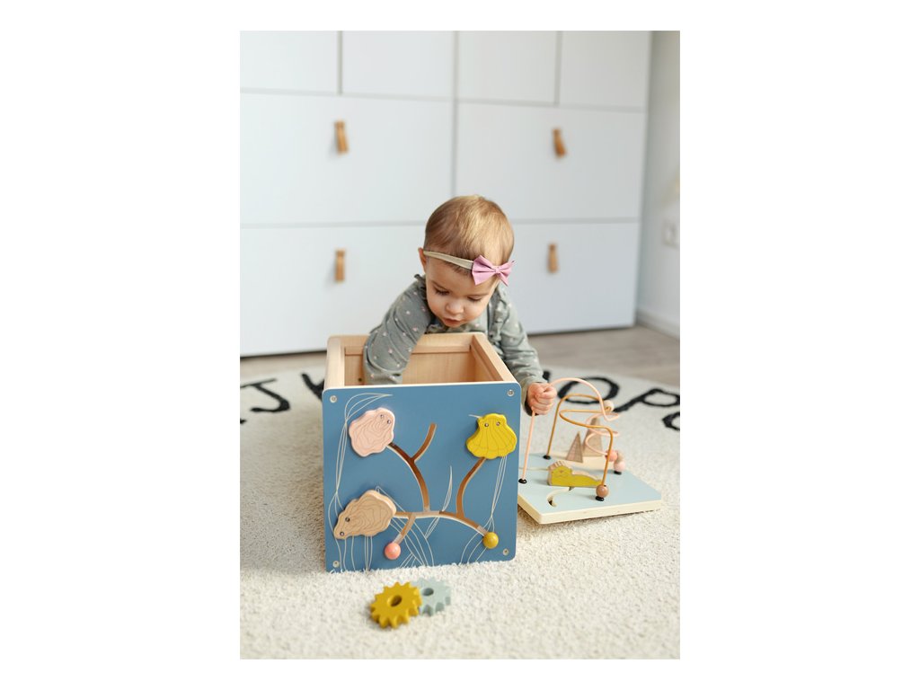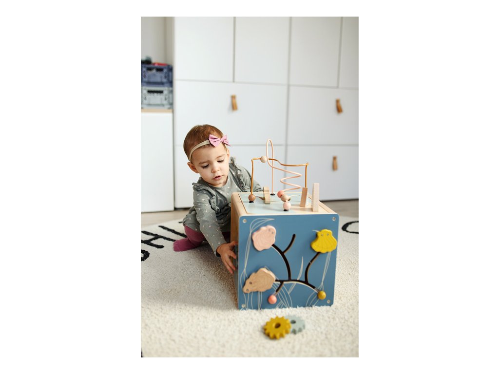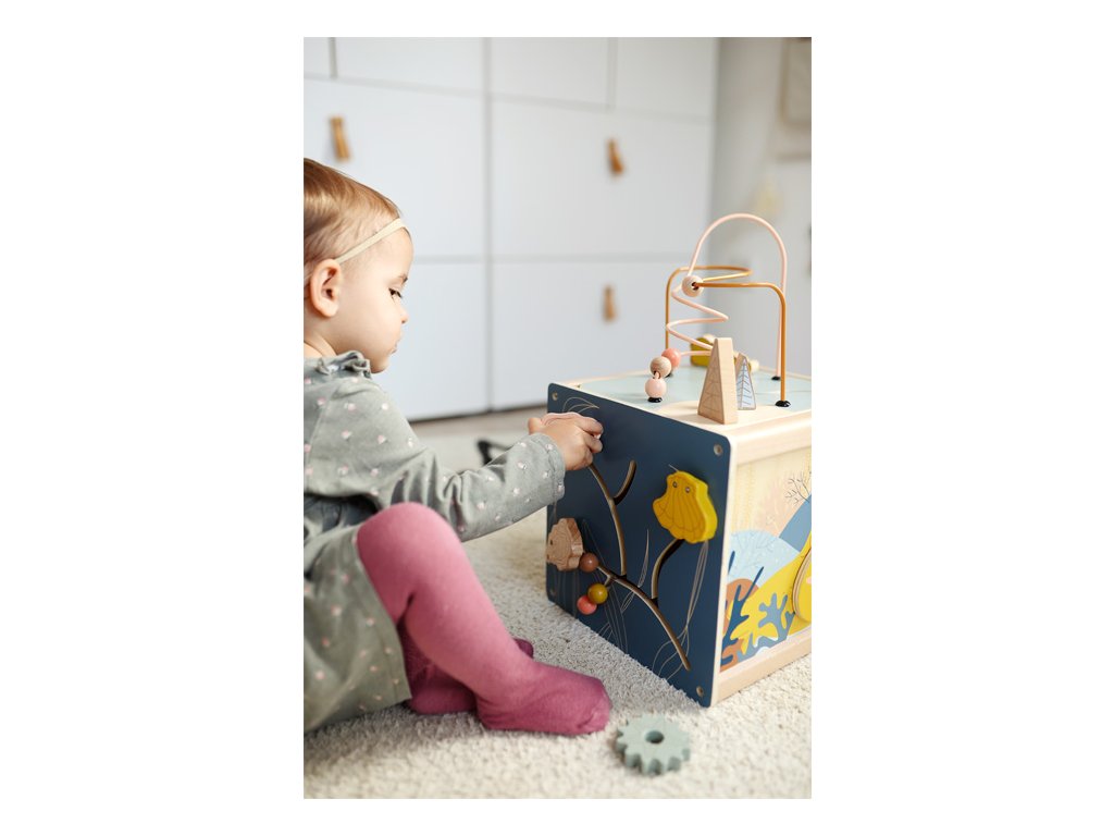 Všestranná dřevěná kostka pro motorické aktivity se dvěma korálkovými bludišti, gumovými stromy, za které se lze chytit, a také posuvným bludištěm na víku. Hru na ozubená kolečka se čtyřmi odnímatelnými hvězdicemi a na dotek měkkou medúzou lze použít na přiřazování tvarů. Druhé posuvné bludiště i několik zrcátek a malých klapek vybízí děti k tomu, aby si věci zkoušely, objevovaly a udiveně pozorovaly. Odnímatelné víko lze uložit dovnitř kostky, aby se při skladování ušetřilo místo. Motorická kostka působí skvělým dojmem díky kombinaci velkého množství přírodního dřeva a jemných, módních barev a nabízí příjemný haptický dojem díky zaobleným hranám. Hlavní vlastnosti: 5 hracích plochvnitřek kostky nabízí další úložný prostorkvalitní ilustrace v módních barváchtrénuje vnímání, zručnost a jemnou motoriku během hry, učení a objevováníDoplňkové parametry