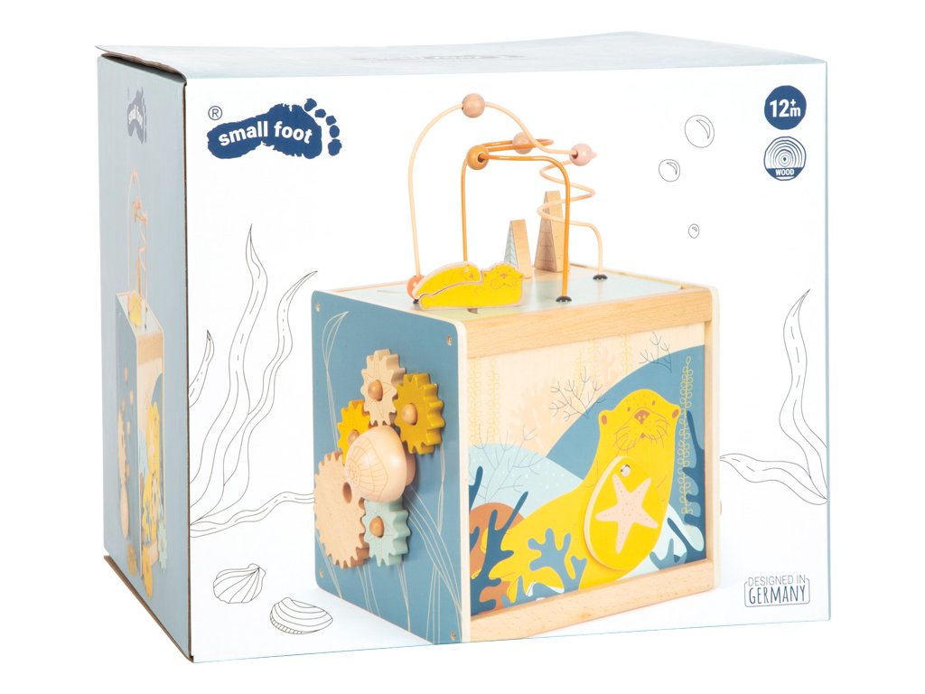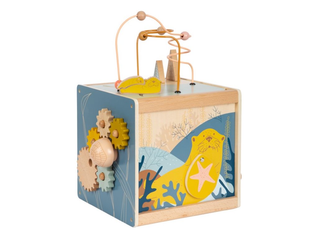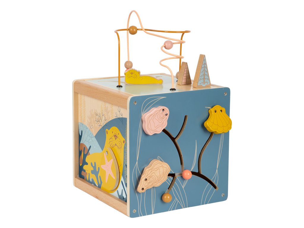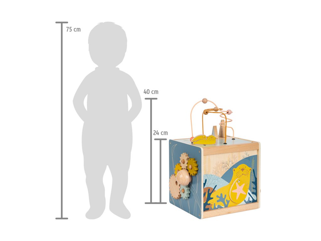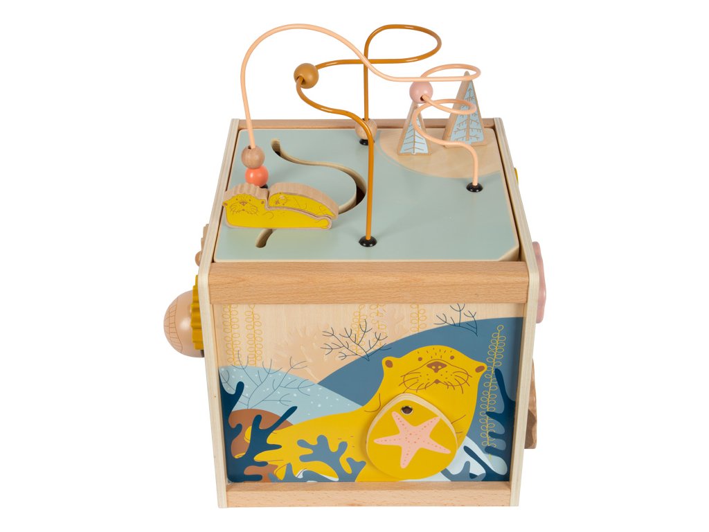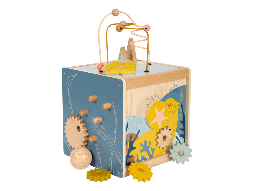 Všestranná dřevěná kostka pro motorické aktivity se dvěma korálkovými bludišti, gumovými stromy, za které se lze chytit, a také posuvným bludištěm na víku. Hru na ozubená kolečka se čtyřmi odnímatelnými hvězdicemi a na dotek měkkou medúzou lze použít na přiřazování tvarů. Druhé posuvné bludiště i několik zrcátek a malých klapek vybízí děti k tomu, aby si věci zkoušely, objevovaly a udiveně pozorovaly. Odnímatelné víko lze uložit dovnitř kostky, aby se při skladování ušetřilo místo. Motorická kostka působí skvělým dojmem díky kombinaci velkého množství přírodního dřeva a jemných, módních barev a nabízí příjemný haptický dojem díky zaobleným hranám. Hlavní vlastnosti: 5 hracích plochvnitřek kostky nabízí další úložný prostorkvalitní ilustrace v módních barváchtrénuje vnímání, zručnost a jemnou motoriku během hry, učení a objevováníDoplňkové parametry