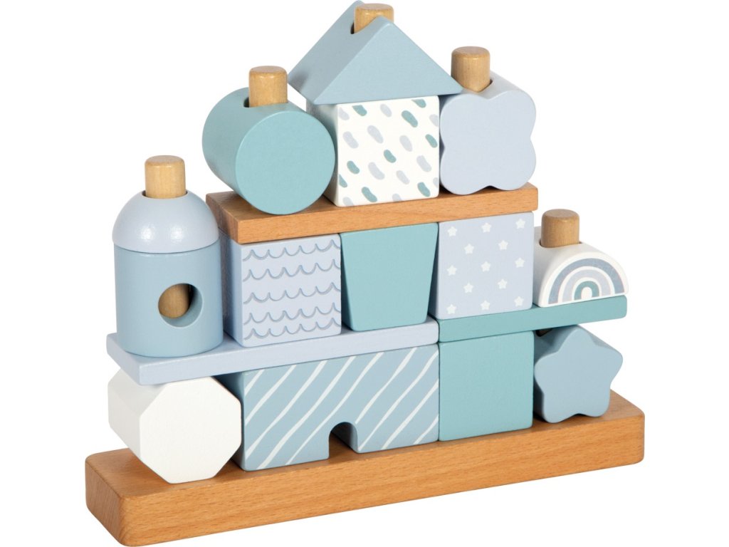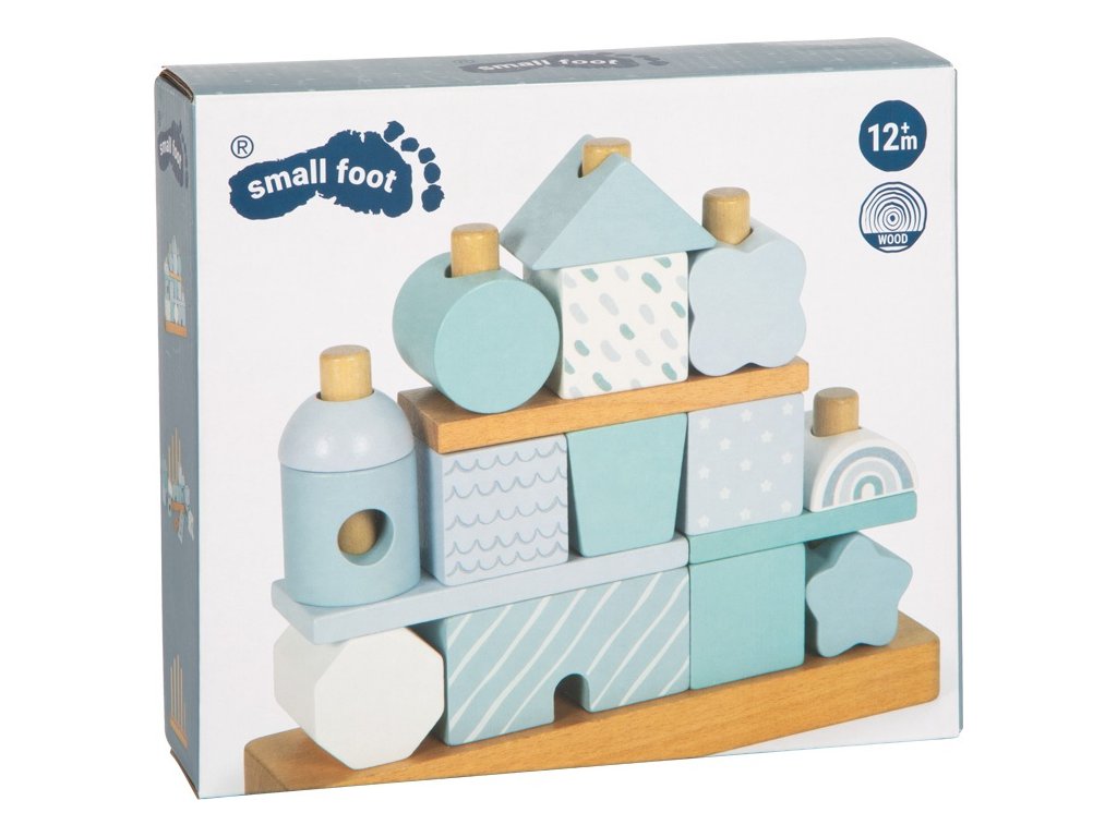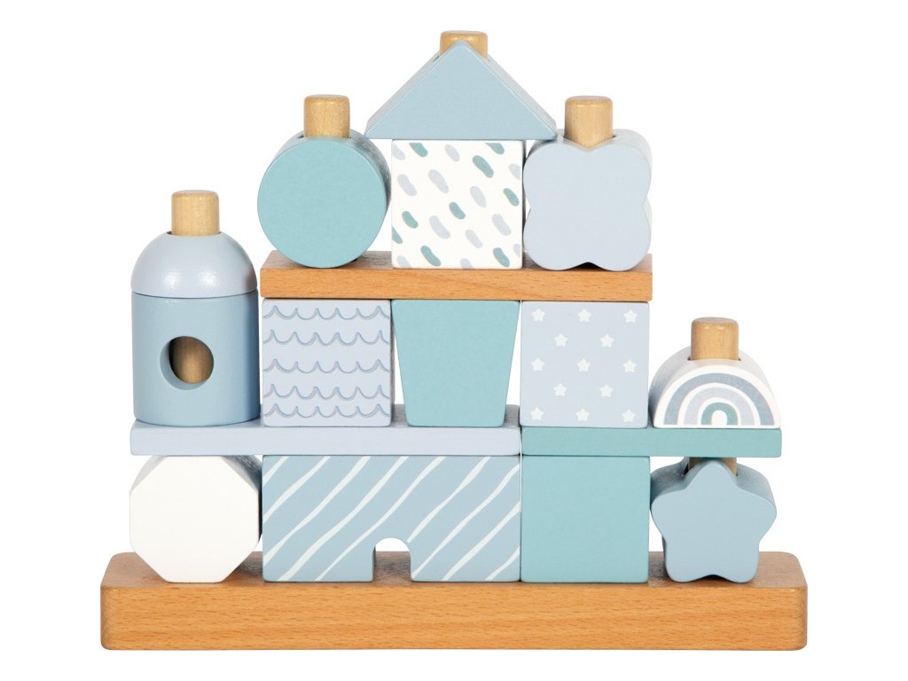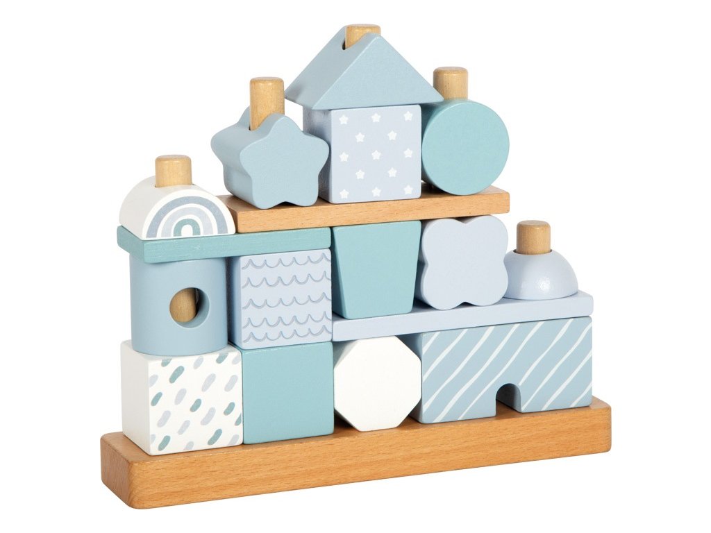 Tento dřevěný stohovací domeček v jemných pastelových odstínech modré s přírodními prvky okouzlí nejen svým designem, ale i variabilitou. Obsahuje 18 různě tvarovaných a zdobených dílků, které děti inspirují k nasazování na dřevěné tyče a vytváření stále nových variant domečku. Při hraní si tak rozvíjejí jemnou motoriku, koordinaci a kreativitu.Jednotlivé kostičky jsou pečlivě vyrobeny z kvalitního dřeva s bezpečně zaoblenými hranami, a proto jsou ideální i pro malé dětské ručičky. Ideální jako dekorace do dětského pokoje a potěší i jako dárek. Hlavní vlastnosti: 18 dřevěných dílků v různých tvarech a vzorechjemné pastelové barvy v kombinaci s přírodním dřevemrozvíjí jemnou motoriku, koordinaci a kreativitukvalitní a bezpečné zpracování se zaoblenými hranamivhodný jako hračka i jako dekorace do pokojíčkuideální dárek pro nejmenší dětiDoplňkové parametry