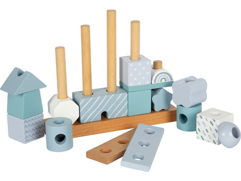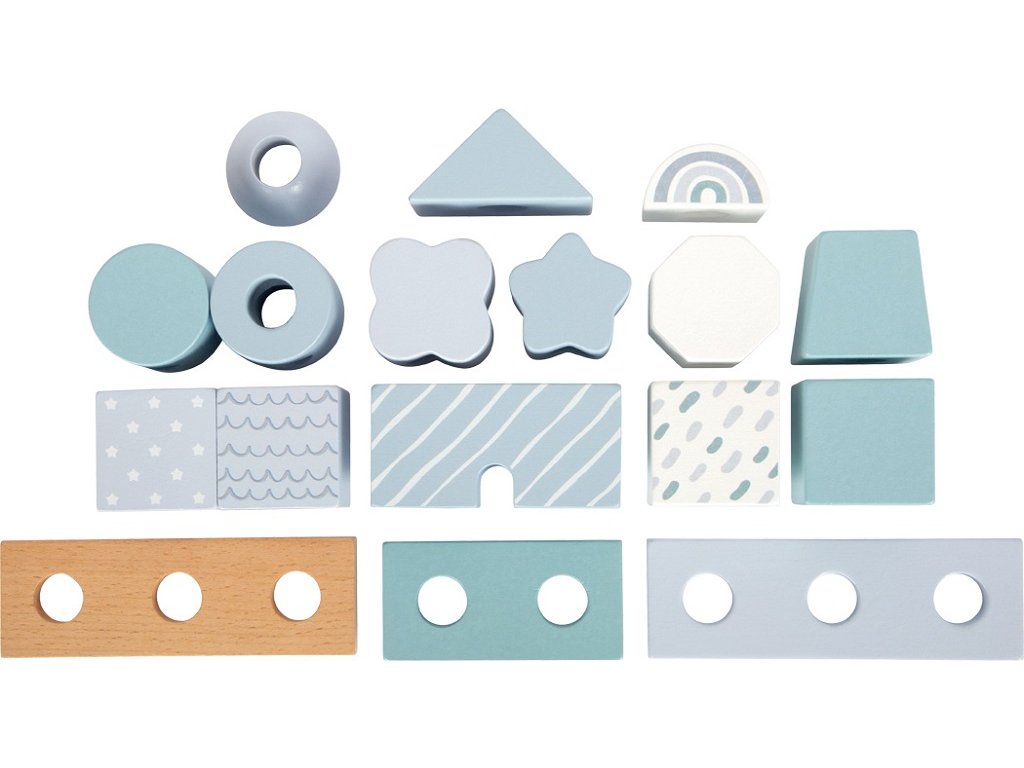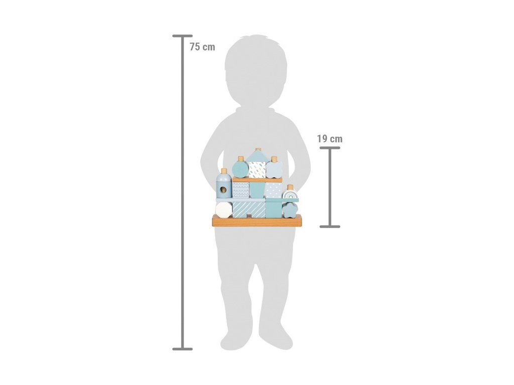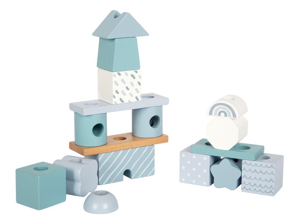 Tento dřevěný stohovací domeček v jemných pastelových odstínech modré s přírodními prvky okouzlí nejen svým designem, ale i variabilitou. Obsahuje 18 různě tvarovaných a zdobených dílků, které děti inspirují k nasazování na dřevěné tyče a vytváření stále nových variant domečku. Při hraní si tak rozvíjejí jemnou motoriku, koordinaci a kreativitu.Jednotlivé kostičky jsou pečlivě vyrobeny z kvalitního dřeva s bezpečně zaoblenými hranami, a proto jsou ideální i pro malé dětské ručičky. Ideální jako dekorace do dětského pokoje a potěší i jako dárek. Hlavní vlastnosti: 18 dřevěných dílků v různých tvarech a vzorechjemné pastelové barvy v kombinaci s přírodním dřevemrozvíjí jemnou motoriku, koordinaci a kreativitukvalitní a bezpečné zpracování se zaoblenými hranamivhodný jako hračka i jako dekorace do pokojíčkuideální dárek pro nejmenší dětiDoplňkové parametry
