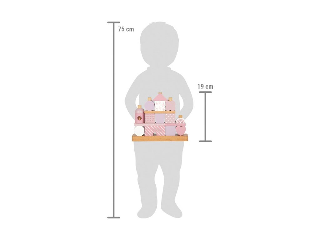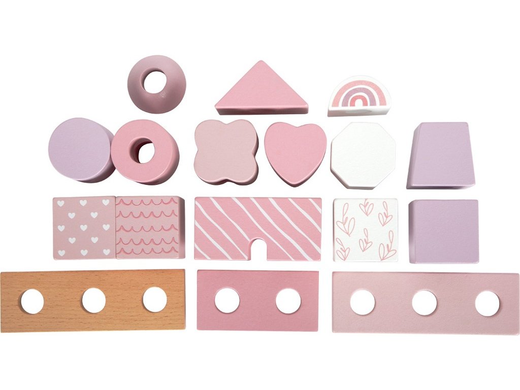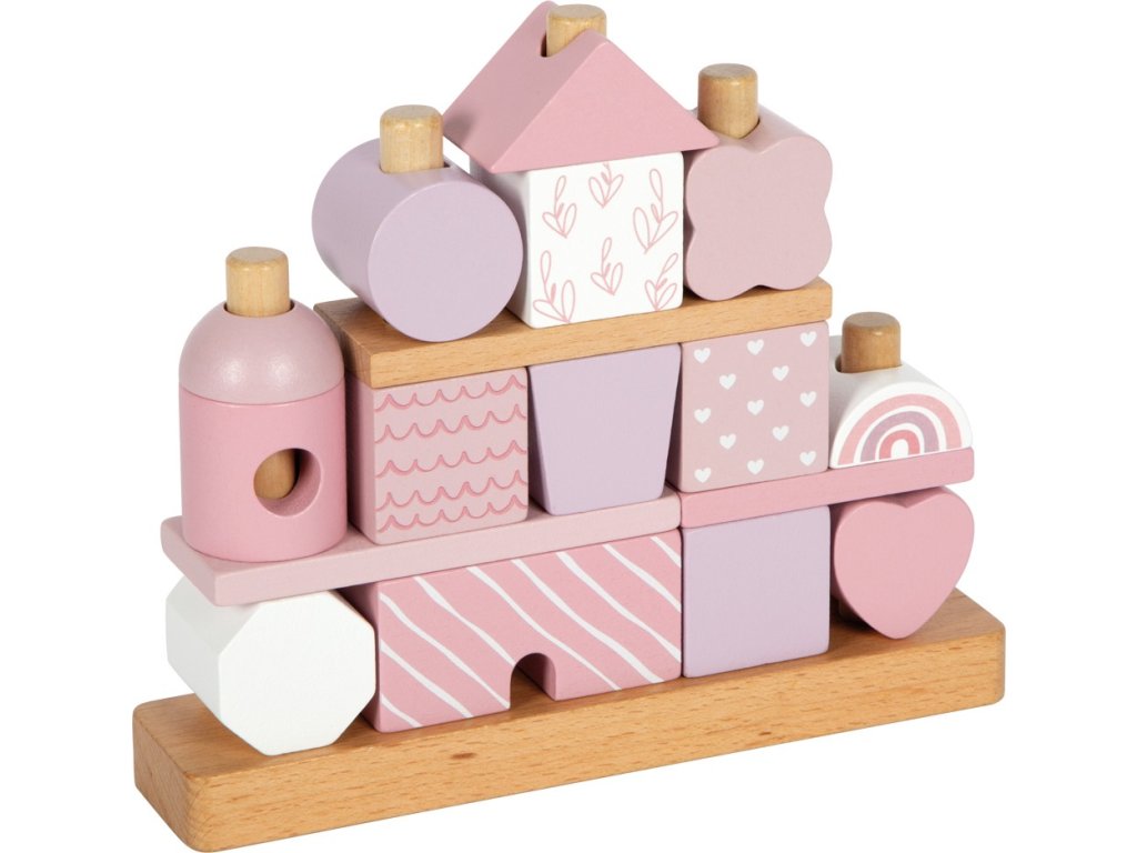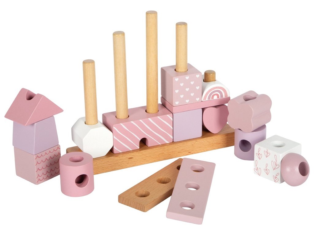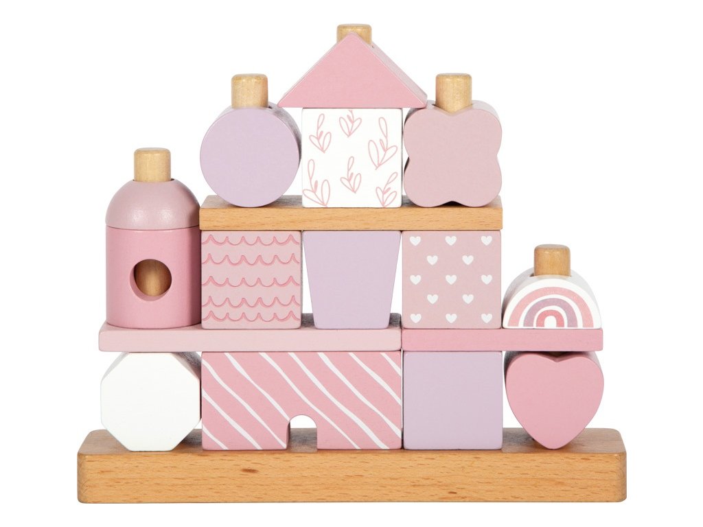 Tento dřevěný stohovací domeček v jemných pastelových odstínech růžové s přírodními prvky okouzlí nejen svým designem, ale i variabilitou. Obsahuje 18 různě tvarovaných a zdobených dílků, které děti inspirují k nasazování na dřevěné tyče a vytváření stále nových variant domečku. Při hraní si tak rozvíjejí jemnou motoriku, koordinaci a kreativitu.Jednotlivé kostičky jsou pečlivě vyrobeny z kvalitního dřeva s bezpečně zaoblenými hranami, a proto jsou ideální i pro malé dětské ručičky. Ideální jako dekorace do dětského pokoje a potěší i jako dárek. Hlavní vlastnosti: 18 dřevěných dílků v různých tvarech a vzorechjemné pastelové barvy v kombinaci s přírodním dřevemrozvíjí jemnou motoriku, koordinaci a kreativitukvalitní a bezpečné zpracování se zaoblenými hranamivhodný jako hračka i jako dekorace do pokojíčkuideální dárek pro nejmenší dětiDoplňkové parametry