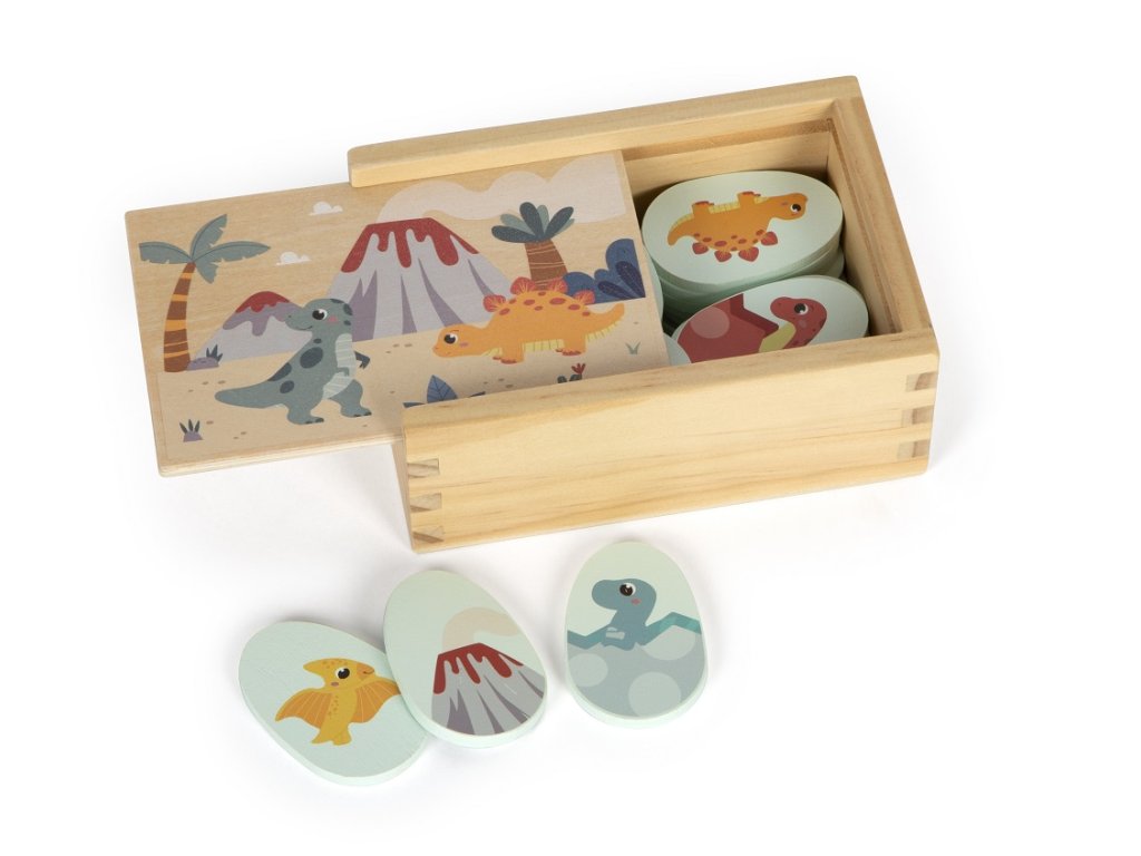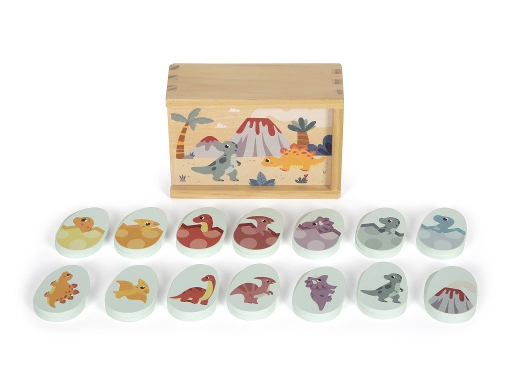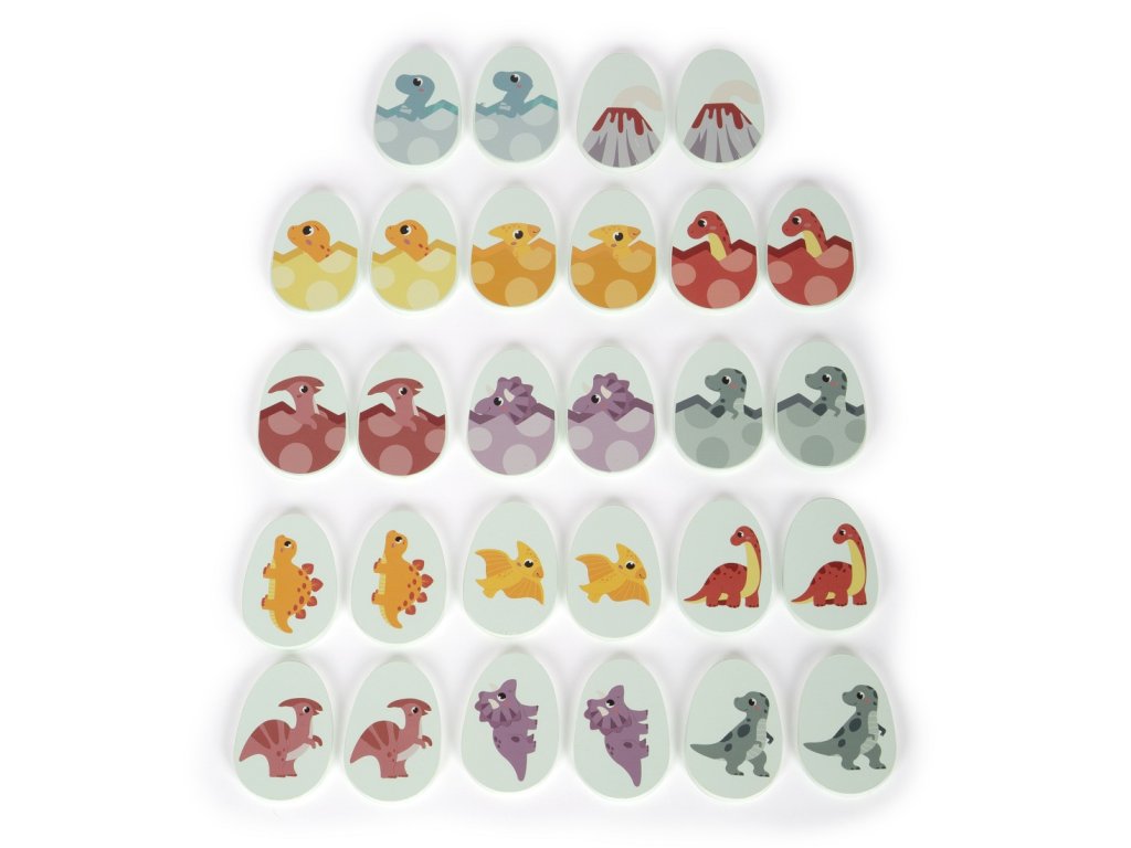 Tato klasická hra v kompaktním formátu jistě přinese dlouhotrvající herní zábavu fanouškům dinosaurů všech věkových kategorií. Ponořte se do dobrodružného světa prehistorické éry. Pexeso v roztomilém motivu dinosauřích vajec je společenská hra pro celou rodinu. Procvičujte své paměťové schopnosti a najděte všech 14 párů odpovídajících obrázků. Tuto společenskou hru lze snadno uložit a přepravovat v krabičce s posouvatelným víkem. Hra je tak vhodná i na cesty. Pexeso je vyrobeno ze 100% certifikovaného dřeva FSC®.