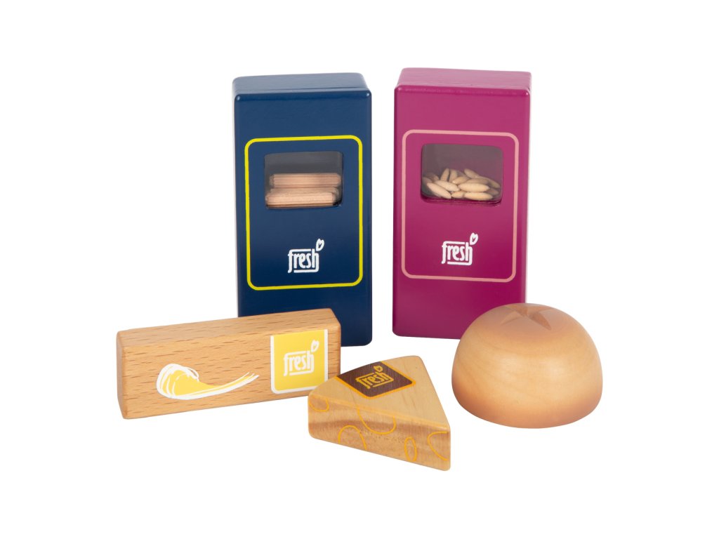 Rozměry olivového oleje: 11 cm, Ø 3 cm Rozměry hořčice: 4x2x9 cm Věk: 3+ Materiál: dřevo Obsahuje 4 díly