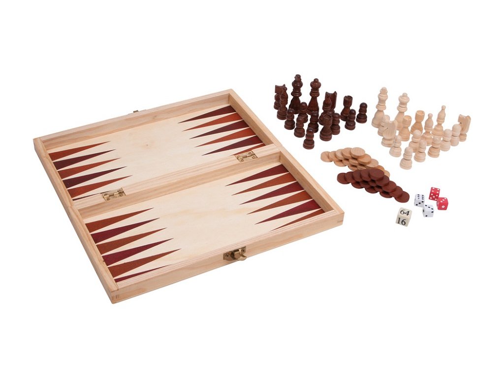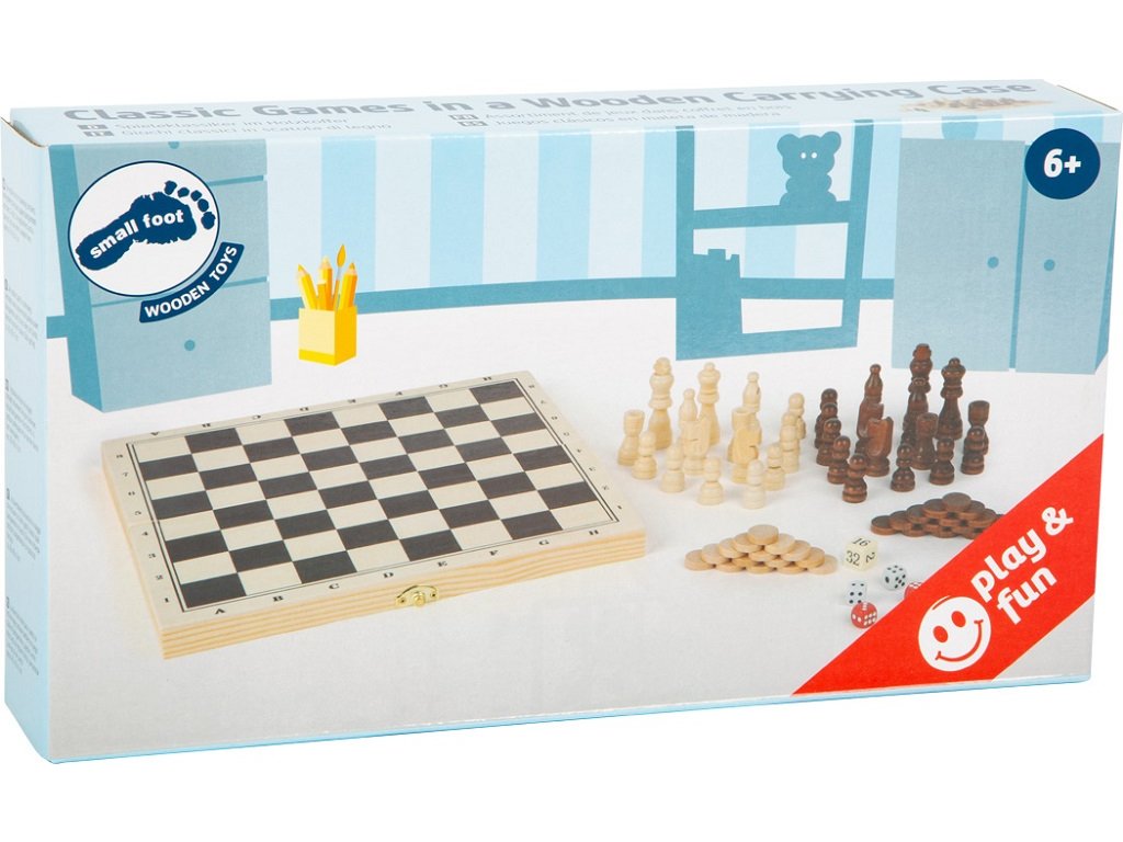 Soubor her pro celou rodinu se třemi klasickými společenskými hrami jako šachy, dáma nebo vrhcáby. Dřevěná "truhlička" zároveň slouží jako hrací deska (jak zvenčí, tak zevnitř). Perfektní řešení pro líné deštivé odpoledne! Hlavní vlastnosti: dlouhotrvající zábavarozvíjí logické myšlení a soustředěnostpro všechny věkové kategorie (nad 6 let)Doplňkové parametry