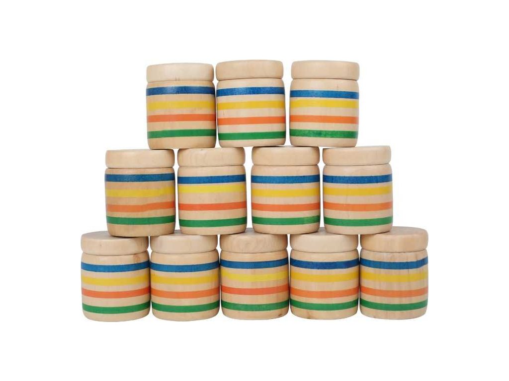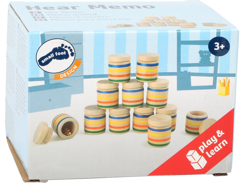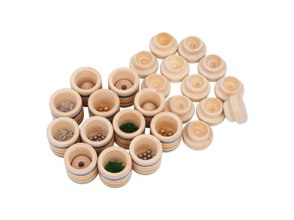 12 vysoce kvalitních dřevěných dóz se šroubovacím uzávěrem dělá z této zvukové hry trenéra paměti. Ve dvou dózách je vždy stejný obsah a cílem hry je tento pár najít. Na vás je, co do dóziček vložíte. Uslyšíš rozdíl mezi skleněnými korálky, oblázky či zvonečky?