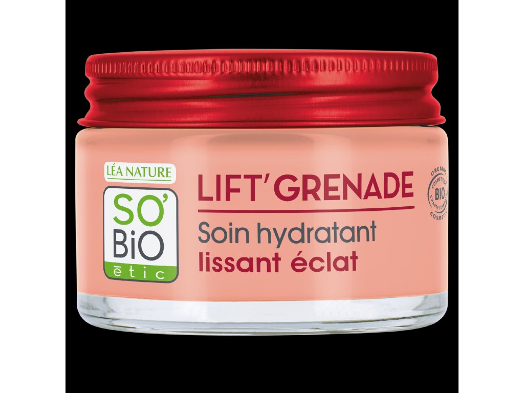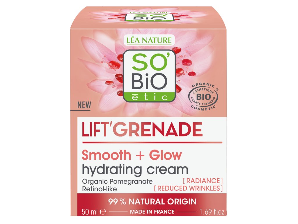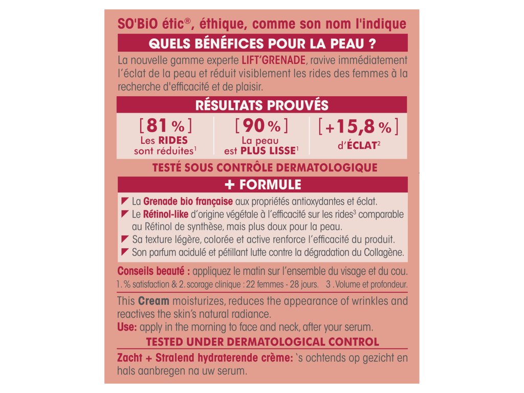 Denní krém SO’BiO étic Lift'Grenade BIO s organickým granátovým jablkem a rostlinnou alternativou retinolu šetrně hydratuje, vyhlazuje a dodává pleti mladistvě rozjasněný vzhled. Jemné přírodní složení bez silikonů, certifikované Ecocert Cosmos Organic, je vhodné pro všechny typy pleti. Při pravidelném nanášení každé ráno na obličej a krk krém pokožku účinně zpevňuje, redukuje jemné vrásky a obnovuje její svěžest i přirozený jas.Doplňkové parametry