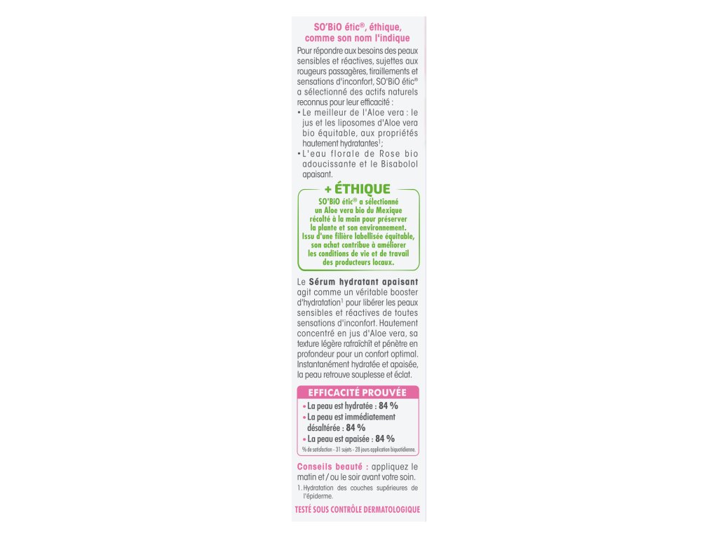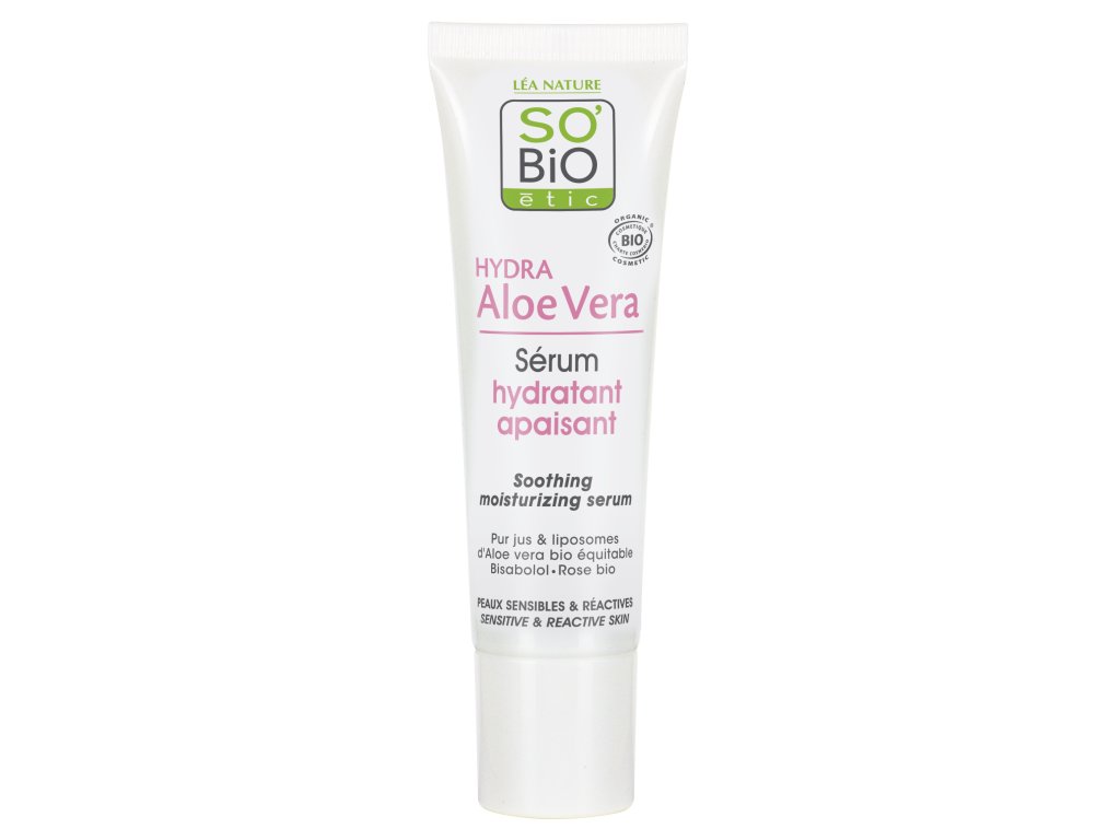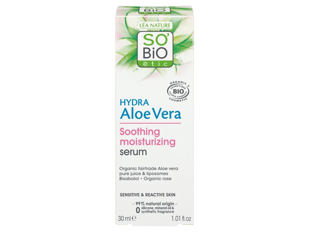 SO’BiO étic pleťové sérum s Aloe vera přináší citlivé a reaktivní pokožce intenzivní zklidnění, vydatnou hydrataci a přirozenou zářivost. Jemná a svěží textura, lehká jako voda, je obohacená o čistou šťávu z aloe v bio kvalitě, která se vstřebává hluboko do pokožky a okamžitě ji zvláčňuje a dodává pocit komfortu. Složení tvoří 99 % přírodních látek, bez silikonů a syntetických parfemací. Sérum je certifikováno Ecocert Cosmos Organic a používá se ráno či večer na obličej a krk před aplikací pleťového krému.Doplňkové parametry
