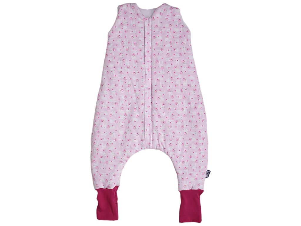 Dětský spací pytel v jemně růžové barvě s motivem zajíčků. Díky nohavicím má dítě volnost pohybu a praktické náplety udrží nožičky v teple.