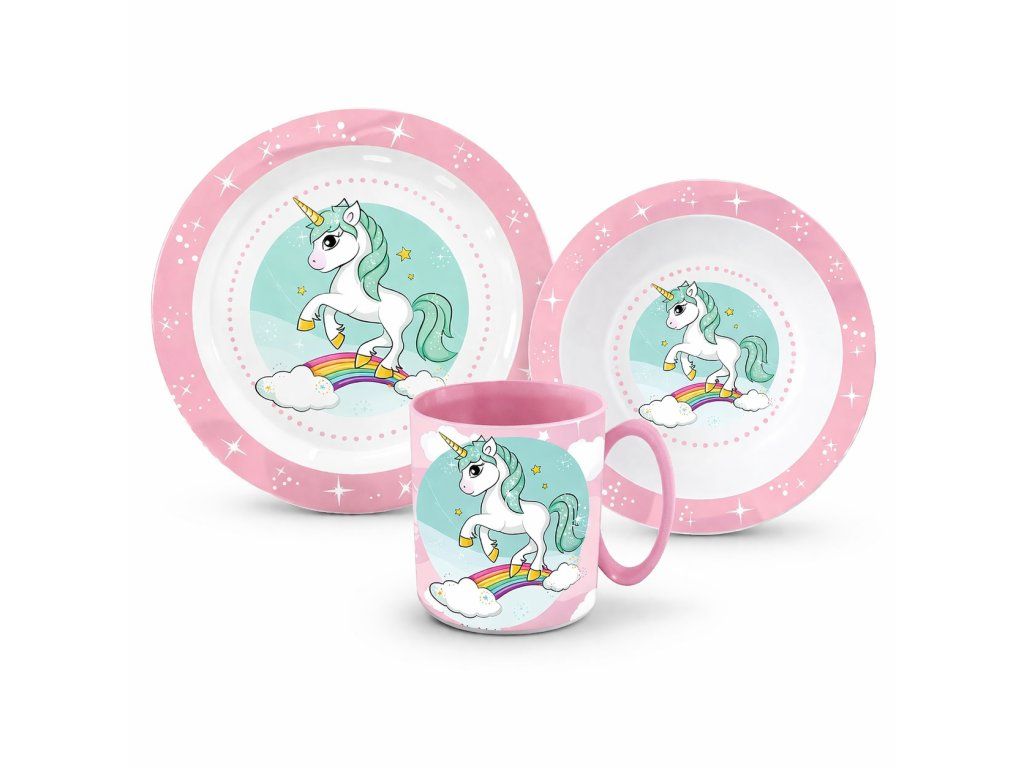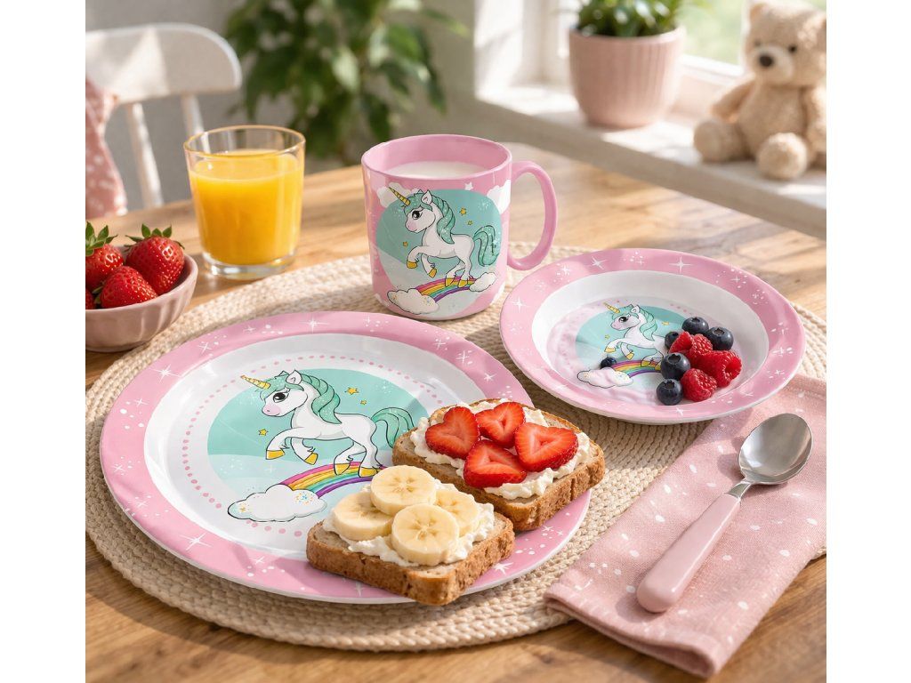 Roztomilý dětský jídelní set s motivem jednorožce potěší každou malou princeznu. Jemné pastelové barvy a pohádkový design přinášejí radost ke každému jídlu a motivují děti k samostatnému stolování.