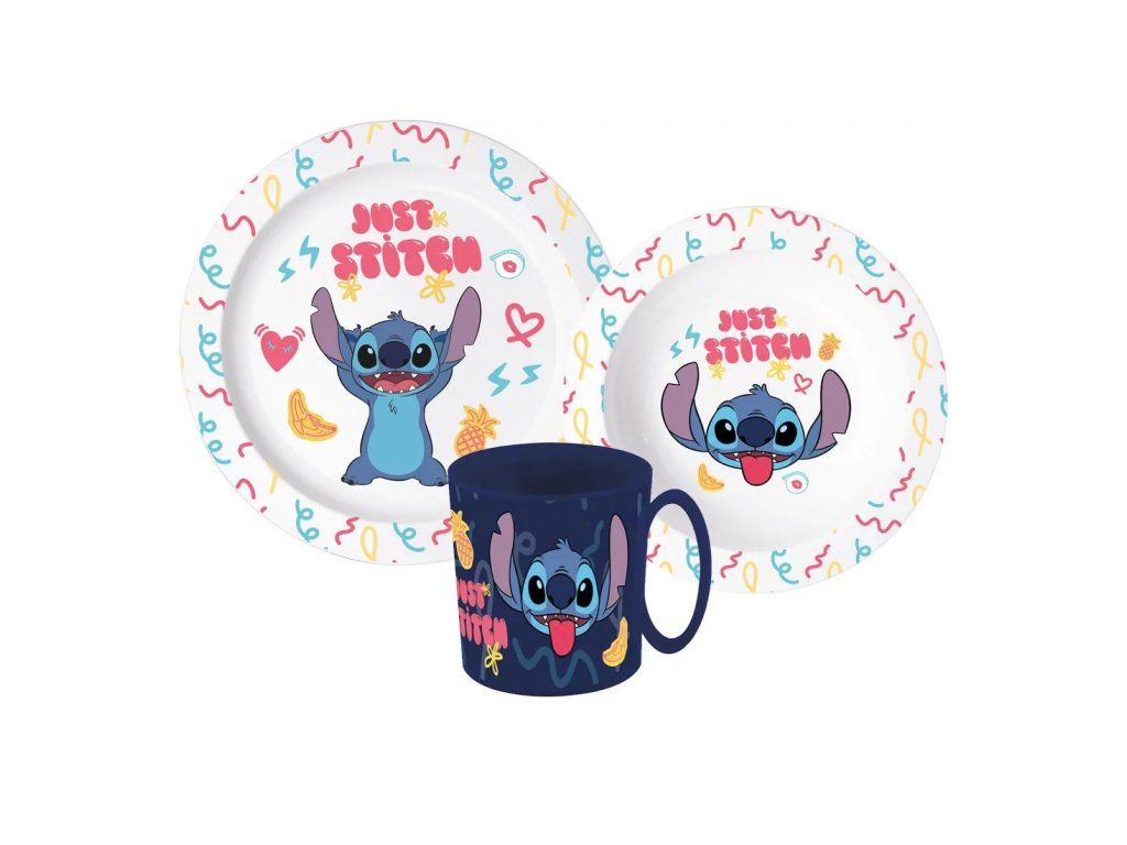 Dětský jídelní set Stitch s hrnkem, talířem a miskou zpříjemní každé jídlo. Ideální pro malé fanoušky roztomilého mimozemšťana.