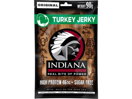 Indiana Turkey Jerky Original je lehký, nemastný snack z krůtího masa s 46 % bílkovin. Skvělá slaná chuť, minimum tuku a ideální volba na cesty, do práce i po sportu.