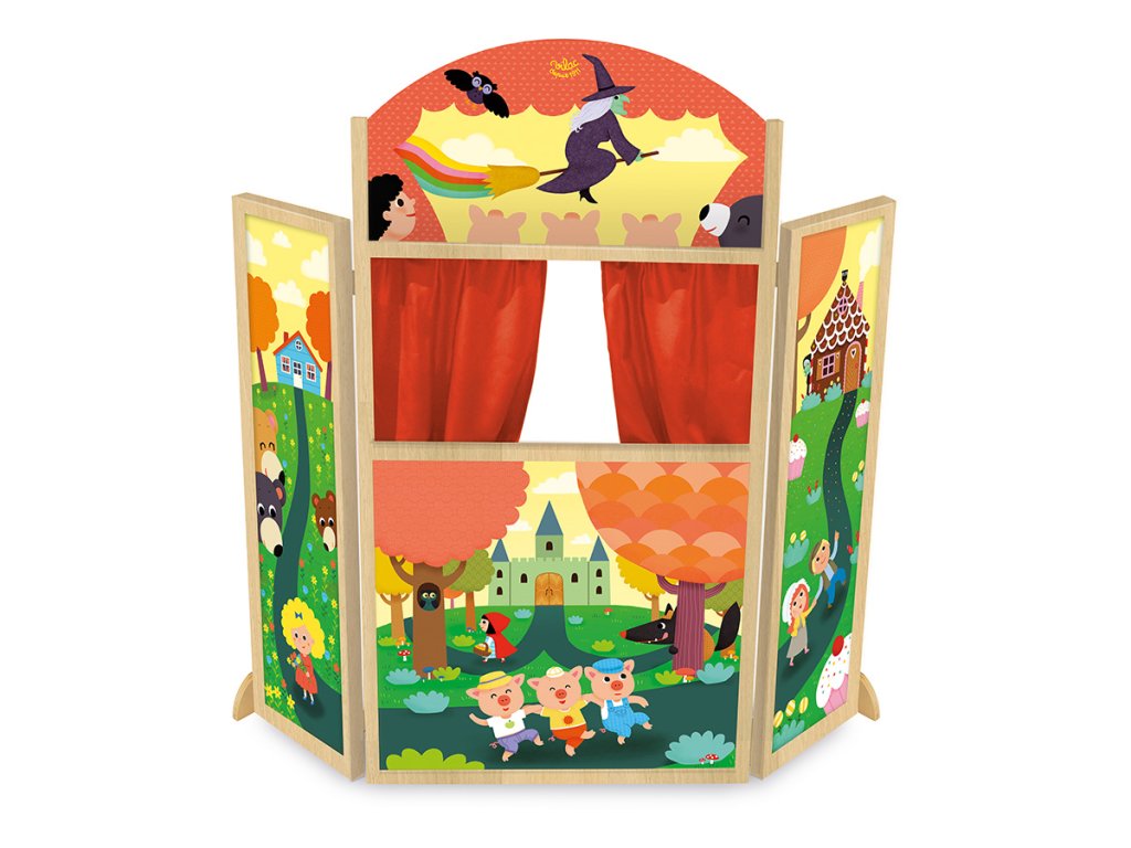 Velkolepé trojstěnné divadlo s motivem hrdinů oblíbených pohádek. Na prostřední stěně má divadlo ve vrchní části okno s oponou. Děti si mohou vymyslet vlastní příběh a zabavit své kamarády či rodinu. Hlavní vlastnosti: třístěnné dřevěné divadlo s 2 skládacími křídly a oponourozvíjí kreativitu, řeč a přestavivost dětíDoplňkové parametry