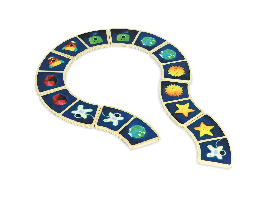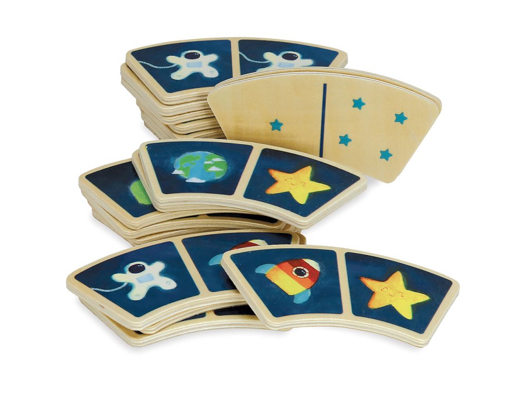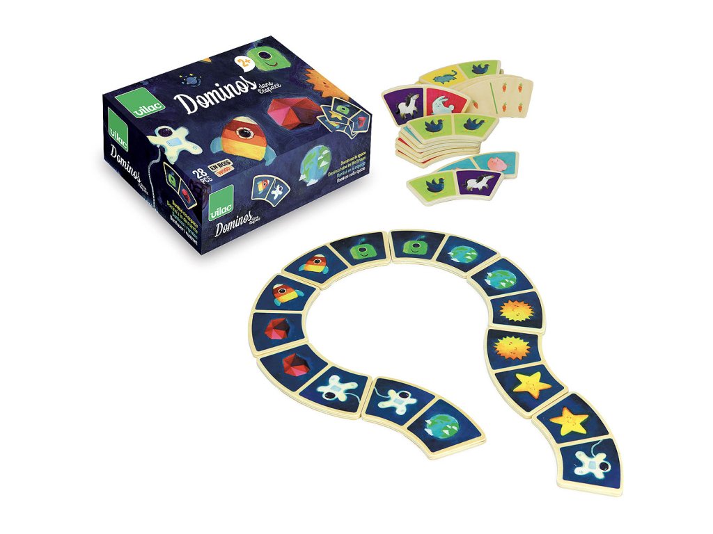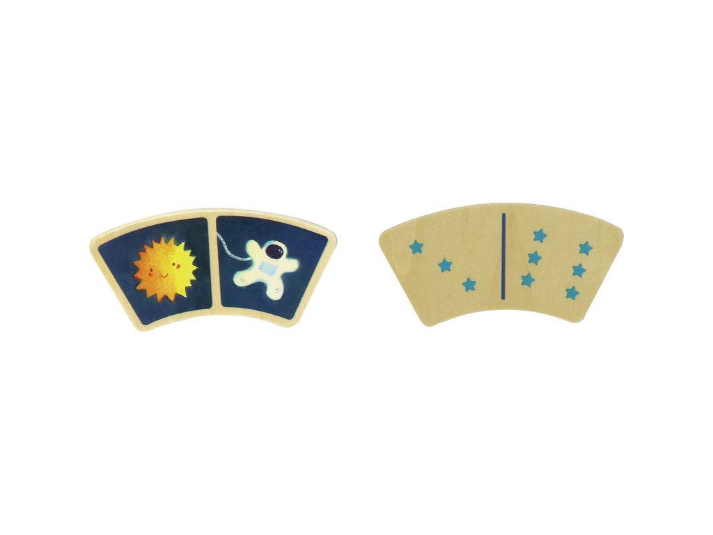 Sada dřevěných dílků domina s motivem vesmíru. Domino je originální díky obloukovitému tvaru jednotlivých dílků a dostatečné velikosti i pro nejmenší děti. Obsahuje 28 dřevěných domin. Hlavní vlastnosti: obloukový tvar domino dílkůobsahuje 28 dílkůvhodné od 2 letDoplňkové parametry