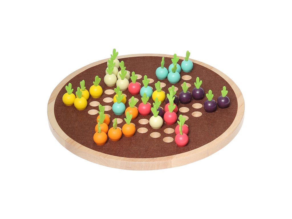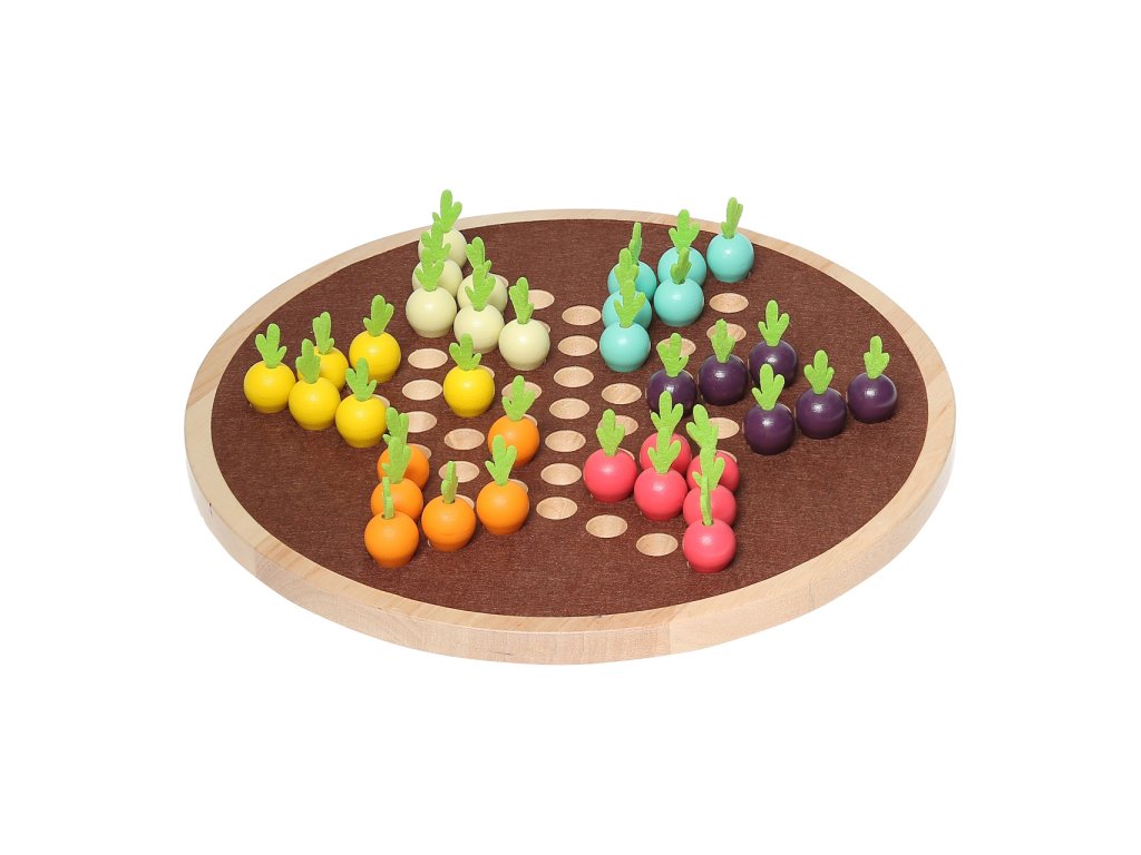 Podaří se Vám přemístit svou zeleninu na druhou stranu dříve než ostatním? Tradiční hra pro všechny věkové kategorie svým poutavým zpracováním v pestrých barvách vzbudí pozornost a stane se ozdobou pokojů nebo kluboven. Je vyrobena z odolného masivního dřeva s doplňky z plsti. Součástí balení je také praktický bavlněný sáček k uložení figurek. Hlavní vlastnosti: hrací deska a 36 figurekpro 2, 4 nebo 6 hráčůjedinečný design a zpracování Zkrácený návod hry:Čínská dáma (varianta halmy) jako zeleninová zahrádka. Cílem hry je dostat svých 6 figurek do protilehlého cípu hvězdy jako první. Vždy se začíná v cípu, který je nejdál od hráče – protilehlého k němu, figurky postupně posouvá směrem k sobě, do protilehlého (k sobě nejbližšího) cípu hvězdy. Při 2 nebo 4 hráčích zůstanou některé cípy volné. Figurky nelze brát. Vítězí hráč, který jako první dostane všech 6 figurek na cíp protilehlý startovnímu cípu.Pohyby figurek:Dopředu nebo dozadu o 1 pole v jakémkoliv směru. Mohou přeskakovat ostatní figurky několikrát za sebou (jen sousední k té, kterou pohybujete). Mezi přeskoky můžete měnit směr. Figurky nelze na protilehlý cíp hvězdy posunout, tento přesun je povolen pouze při přeskakování, tzn. figurka musí do cípu doskákat.Doplňkové parametry
