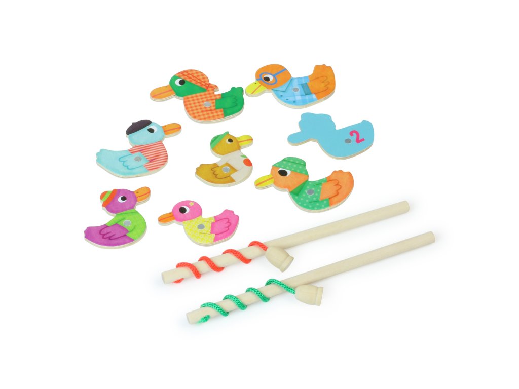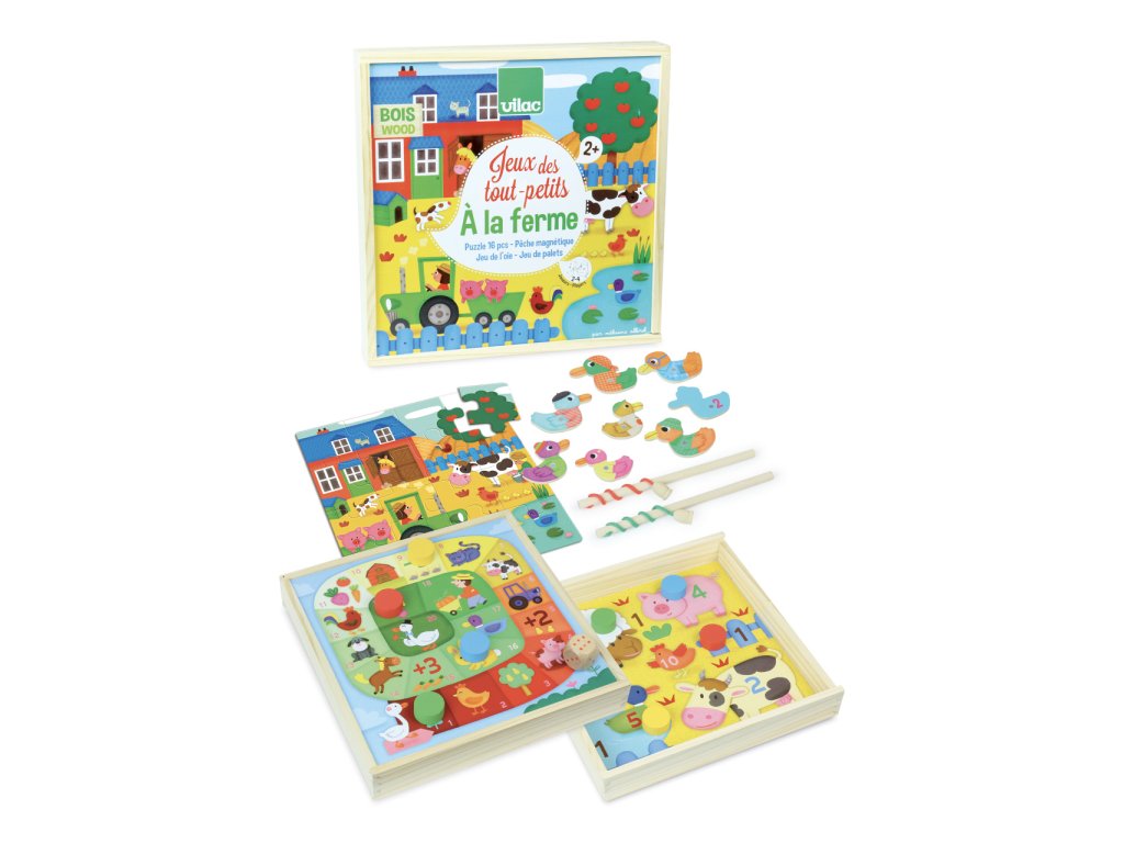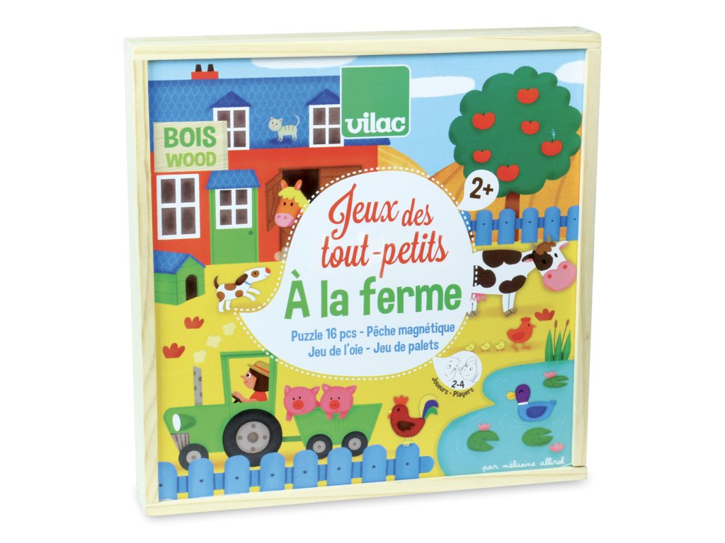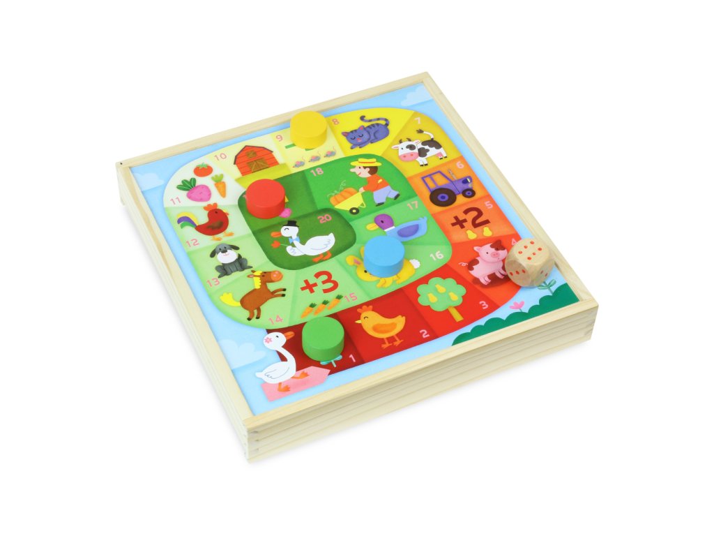 O odpolední zábavu máte postaráno! Sada her upravených pro nejmenší děti, s roztomilými zvířátky z farmy. Obsahuje puzzle s velkými dílky, házení na terč, magnetické rybaření a Husí hru. V Husí hře se hráči pohybují po spirálovitém hracím poli a snaží se vyhnout políčkům s nástrahami. Všechny součásti jsou uschovány v praktické dřevěné krabici, jejíž bohatě dekorované víko slouží jako herní plán. Hlavní vlastnosti: pro 2–4 hráče4 v 1 - puzzle, rybaření, házení na terč a Husí hra16 dílků puzzle, 2 udice a 8 kachen, 4 hrací žetony a kostkapraktické balení s herními plányDoplňkové parametry