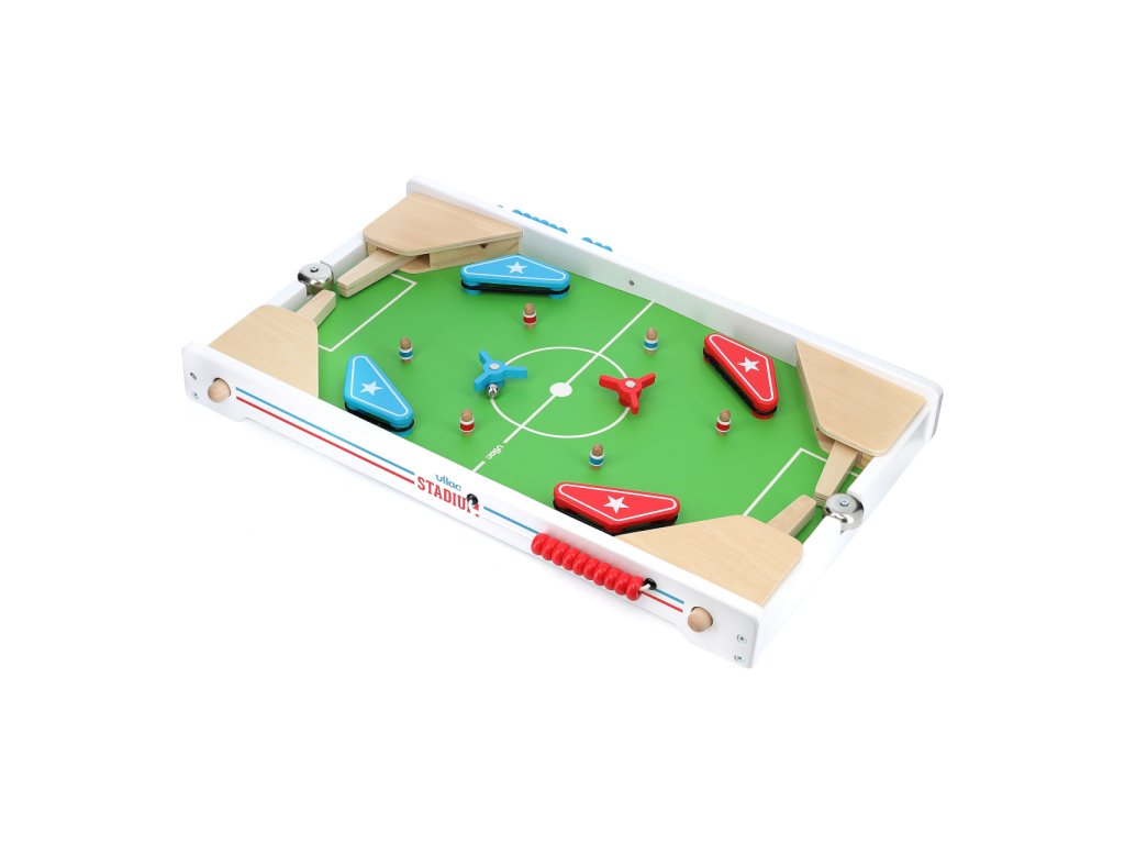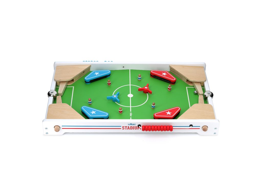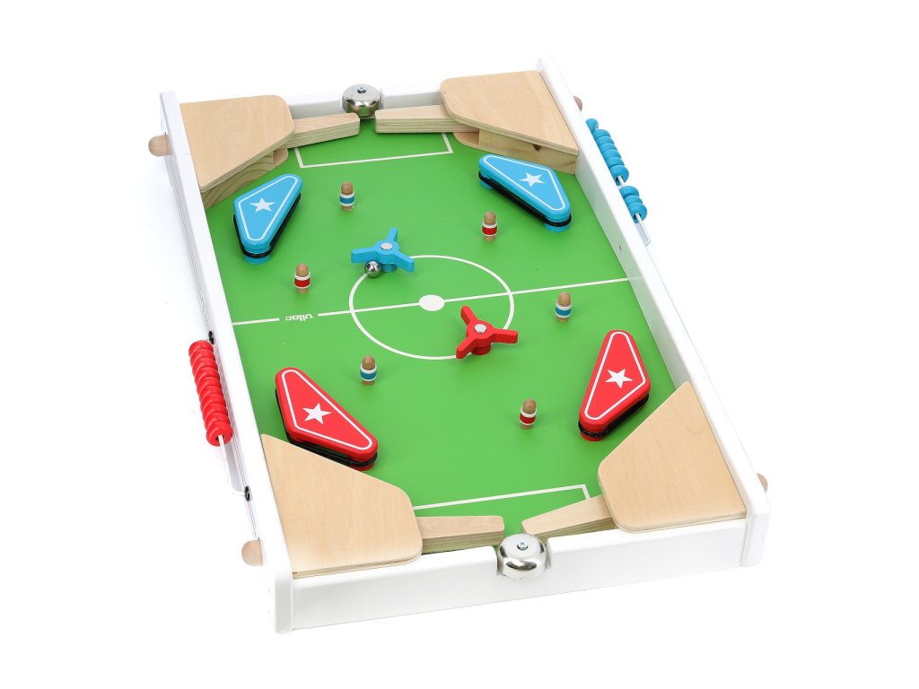 Ovládejte pálky pomocí tlačítek a pokuste se přes hřiště s množstvím překážek vstřelit soupeři gól v jedinečné stolní hře kombinující fotbal a pinball. Branky jsou vybaveny malými zvonečky a hraje se kovovými kuličkami, inkasovanou branku tak vždy oznamuje pronikavé zazvonění. Po stranách hracího stolu jsou umístěna počítadla pro zaznamenávání průběhu zápasu. Odolné dřevěné provedení ze silné překližky zajišťuje dlouhou životnost. Hlavní vlastnosti: hrací stůl a 3 kuličkyatraktivní a odolné dřevěné zpracováníDoplňkové parametry