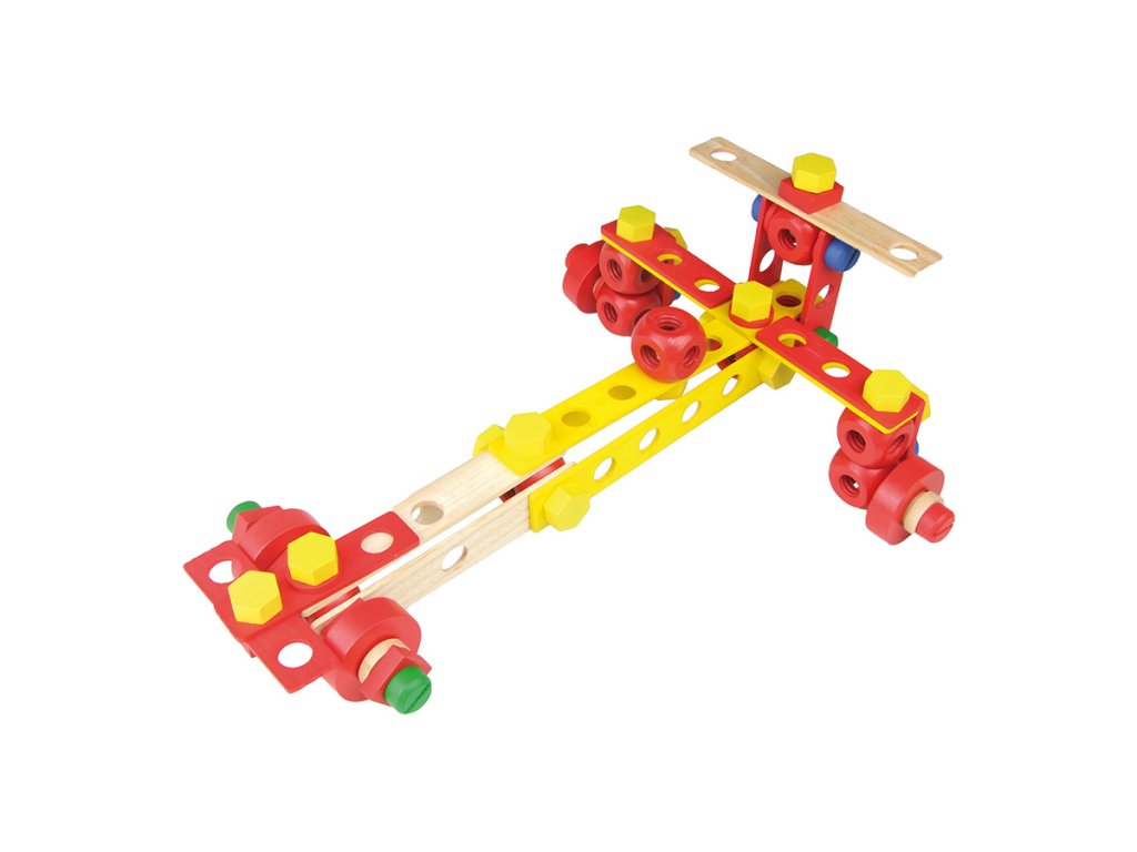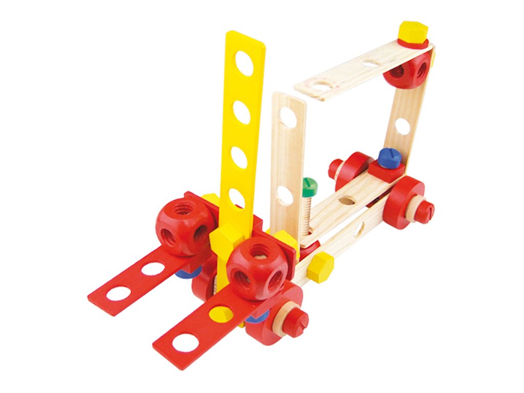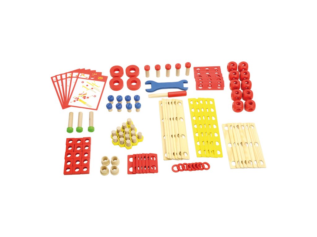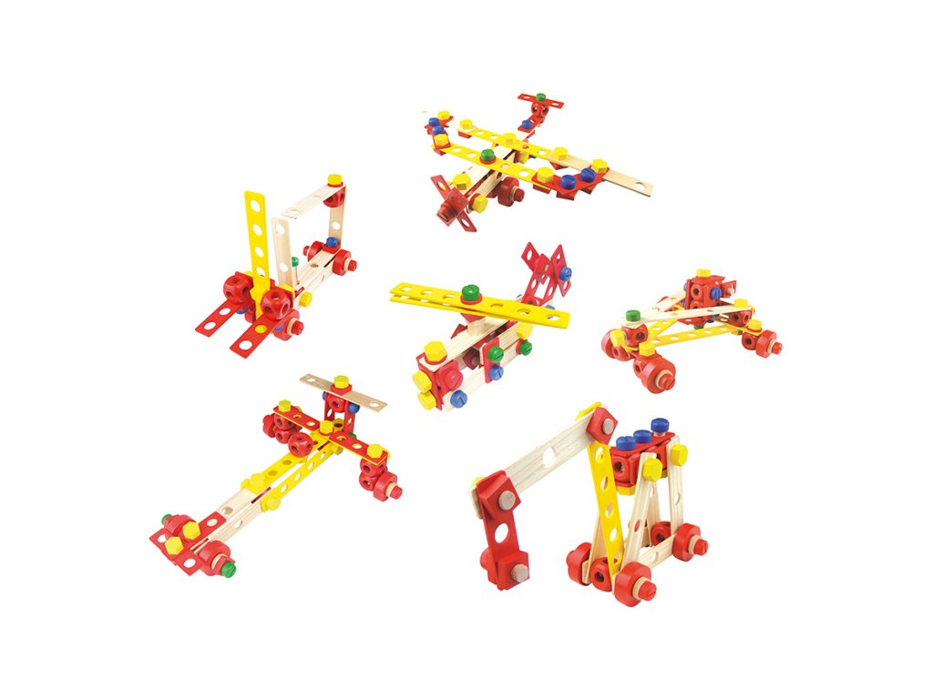 Stavebnice vyrobená z masivního dřeva. Obsahuje 106 různých barevných i přírodních desek, šroubků, matic a nářadí, které pomáhají dětem rozvíjet jejich představivost. Balení také obsahuje šest stavebních návodů. Kompletní box, který je ideální jako první dřevěná stavebnice pro Vaše dítko. Hlavní vlastnosti: obsahuje 106 dílků různých barevpodporuje kreativitu a prostorovou představivost