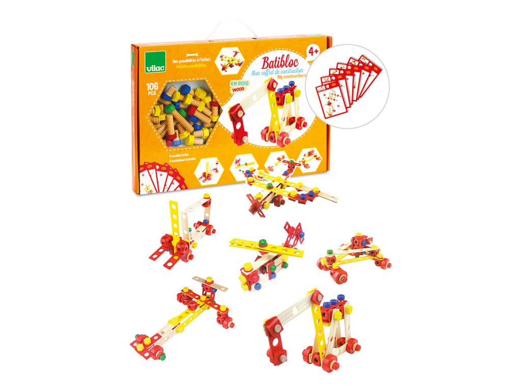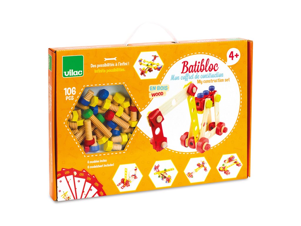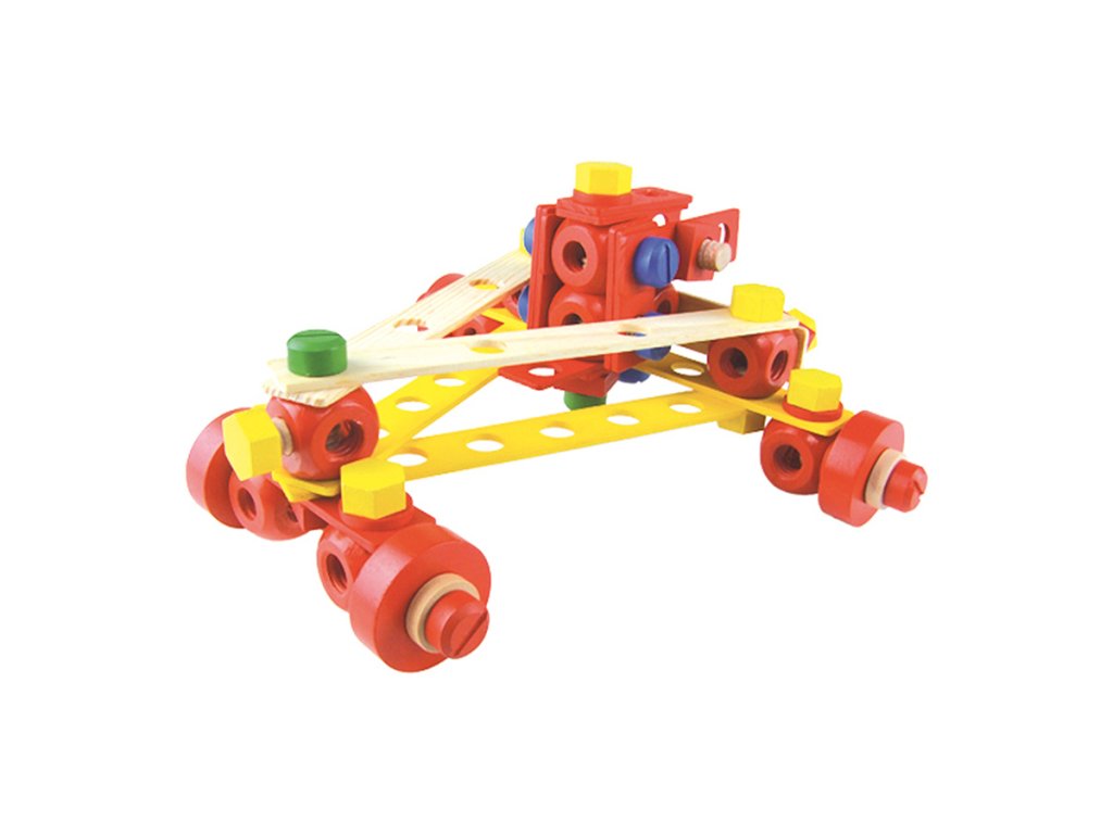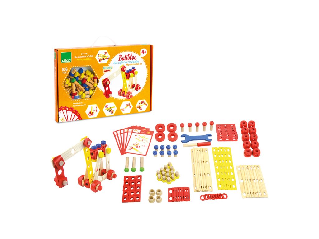 Stavebnice vyrobená z masivního dřeva. Obsahuje 106 různých barevných i přírodních desek, šroubků, matic a nářadí, které pomáhají dětem rozvíjet jejich představivost. Balení také obsahuje šest stavebních návodů. Kompletní box, který je ideální jako první dřevěná stavebnice pro Vaše dítko. Hlavní vlastnosti: obsahuje 106 dílků různých barevpodporuje kreativitu a prostorovou představivost