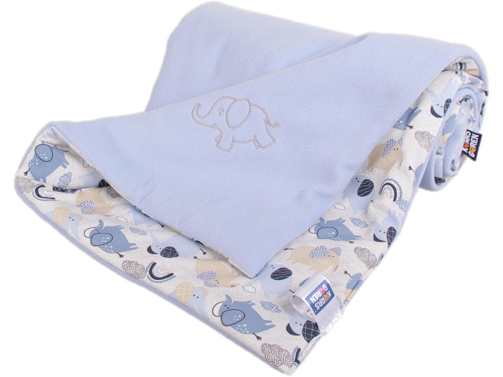 Zateplená dětská deka v provedení fleece, vatelín, bavlna. Barva modrá, motiv slonů. Rozměr 70 x 100 cm. Praní na 30 °C. Česká výroba. Deka je vhodná do kočárku, do autosedačky i na doma, lze použít i jako dětskou peřinku.