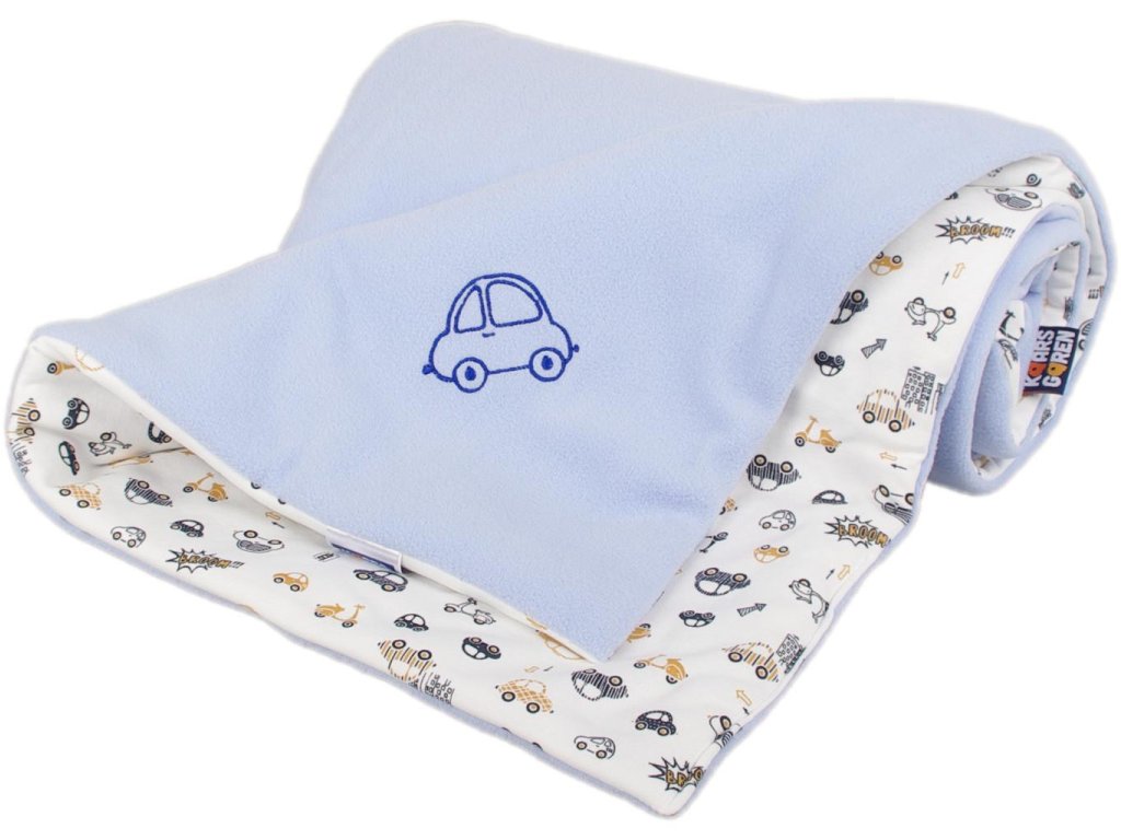 Zateplená dětská deka v provedení fleece, vatelín, bavlna. Barevnost povrch světlemodrá podšívka tištěná autíčka na smetanovém podkladu. Rozměr 70 x 100 cm. Praní na 30° C. Česká výroba.