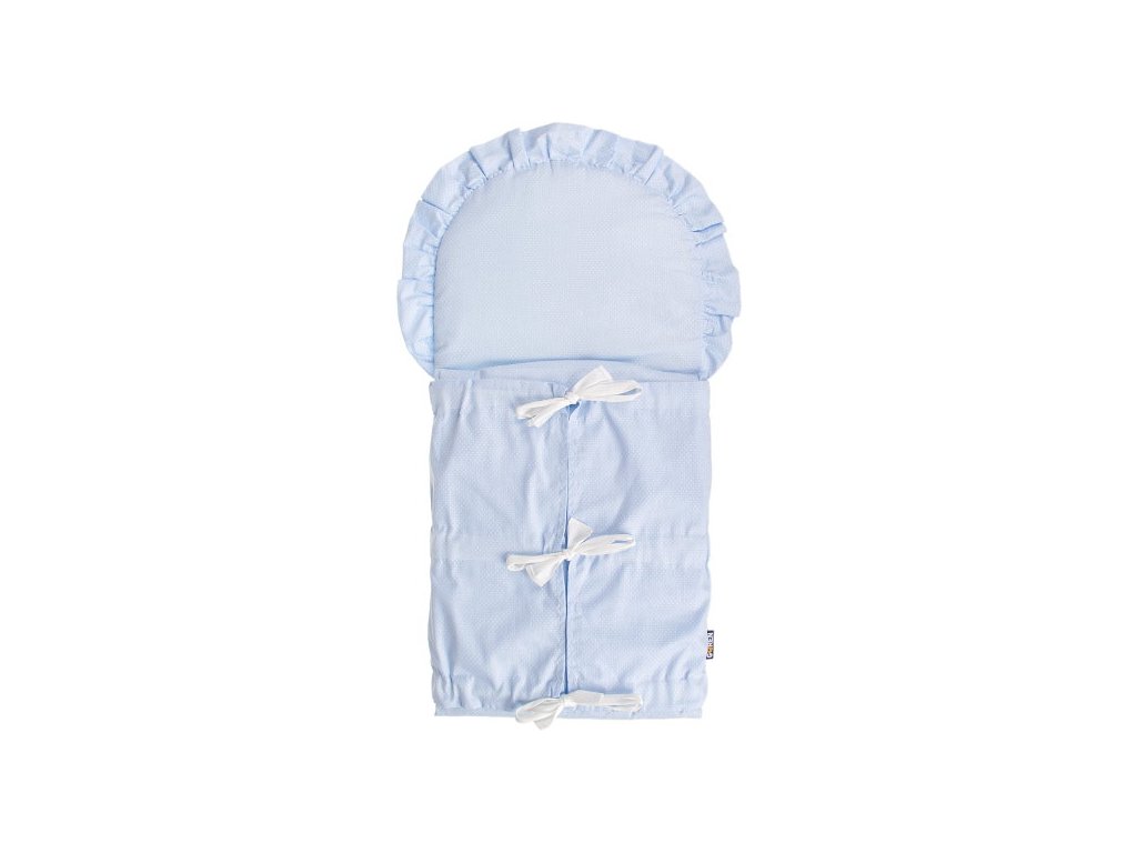Potah klasické zavinovačky s trojitým vázáním ve světle-modré barvě s motivem bílých puntíků. K potahu je nutné dokoupit ještě výplň, aby byla zavinovačka kompletní. Doporučujeme pořídit dva, nebo tři potahy a jednu výplň. Povlak zavinovačky je ze 100% bavlny a lze ho prát v pračce na 40° C, velikost povlaku a tedy i zavinovačky je cca 115 x 33 cm. Zavinovačka je vhodná jako výbava do porodnice, protože novorozená miminka jsou zvyklá na těsný prostor maminčina bříška a po zavinutí se cítí bezpečně a rychle se zklidní.