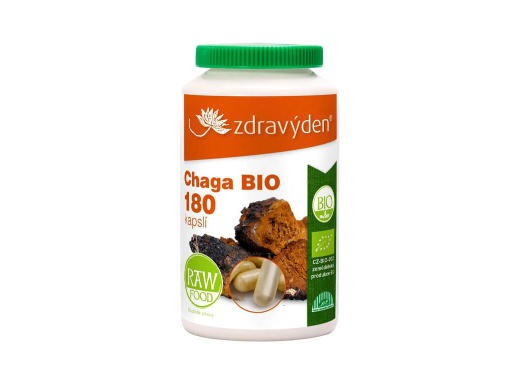 BIO a RAW chaga v kapslích. Chaga je houba rostoucí převážně na kmenech bříz v chladnějších oblastech Evropy, v sibiřské tajze nebo v Asii. Již několik tisíciletí se používá v tradiční čínské medicíně, odkud se rozšířila do Ruska a Evropy.
